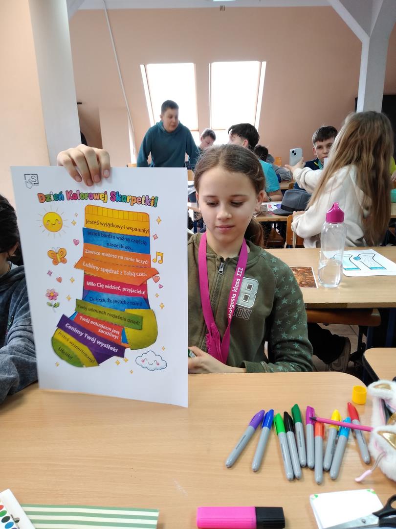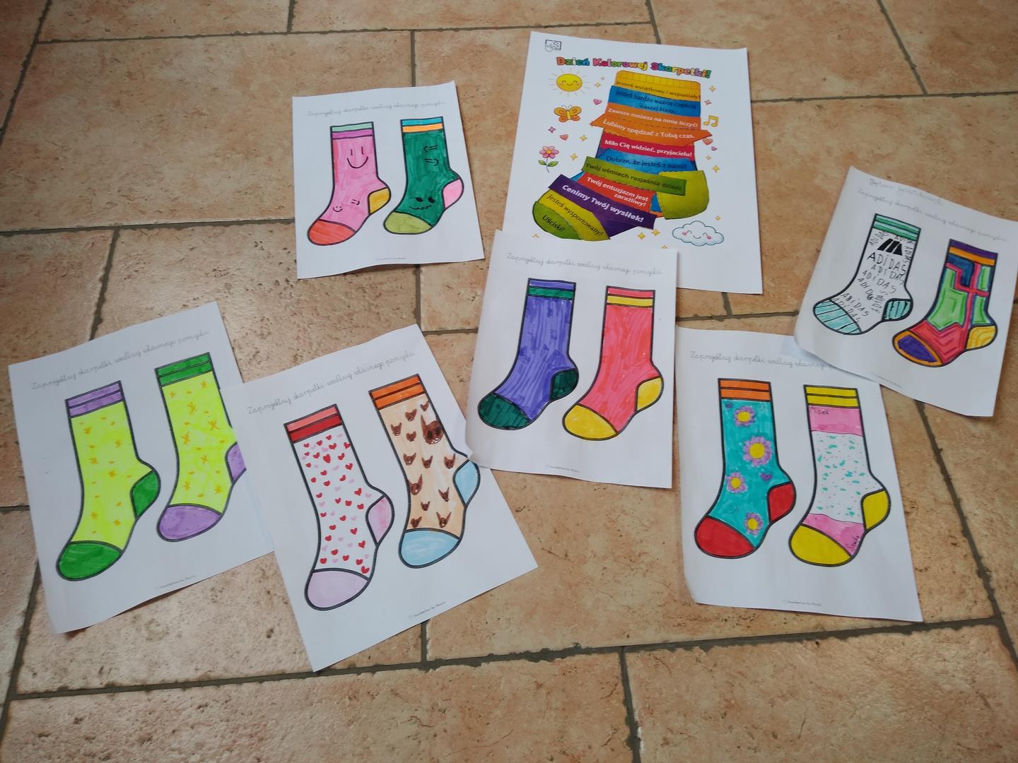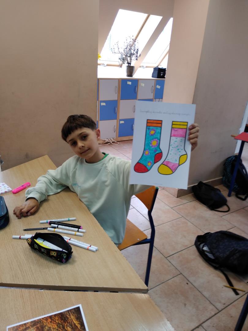 Dzień Kolorowej Skarpetki, obchodzony 21 marca (wraz z pierwszym dniem wiosny), to Światowy Dzień Zespołu Downa. Tego dnia zakładamy dwie różne, kolorowe skarpetki jako symbol solidarności z osobami z zespołem Downa, promując tolerancję, różnorodność i akceptację. Data nawiązuje do trzeciego chromosomu w 21. parze, który powoduje tę wadę genetyczną. Dlatego 20 marca na zajęciach z wychowawcą rozmawialiśmy o ludziach dotkniętych tą chorobą, a potem projektowaliśmy kolorowe skarpetki.