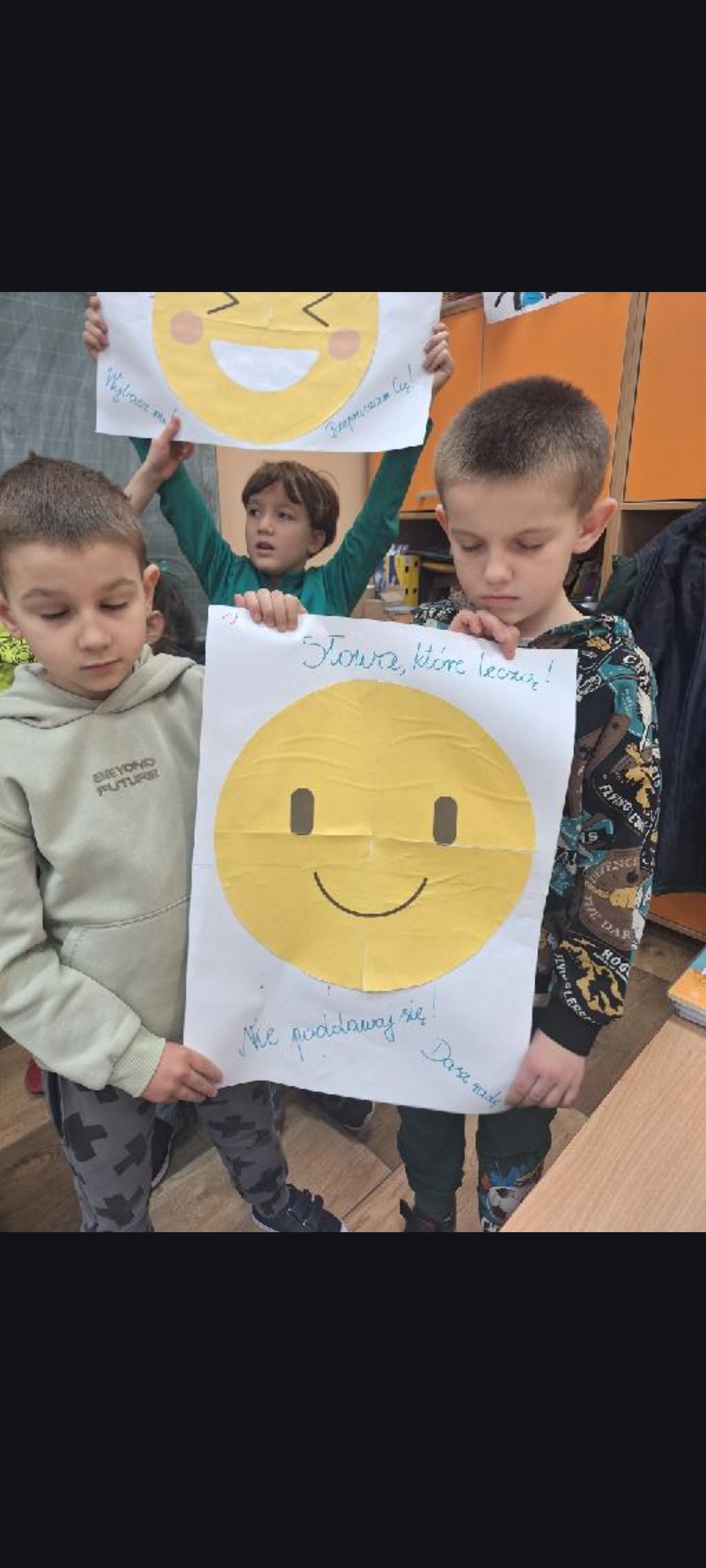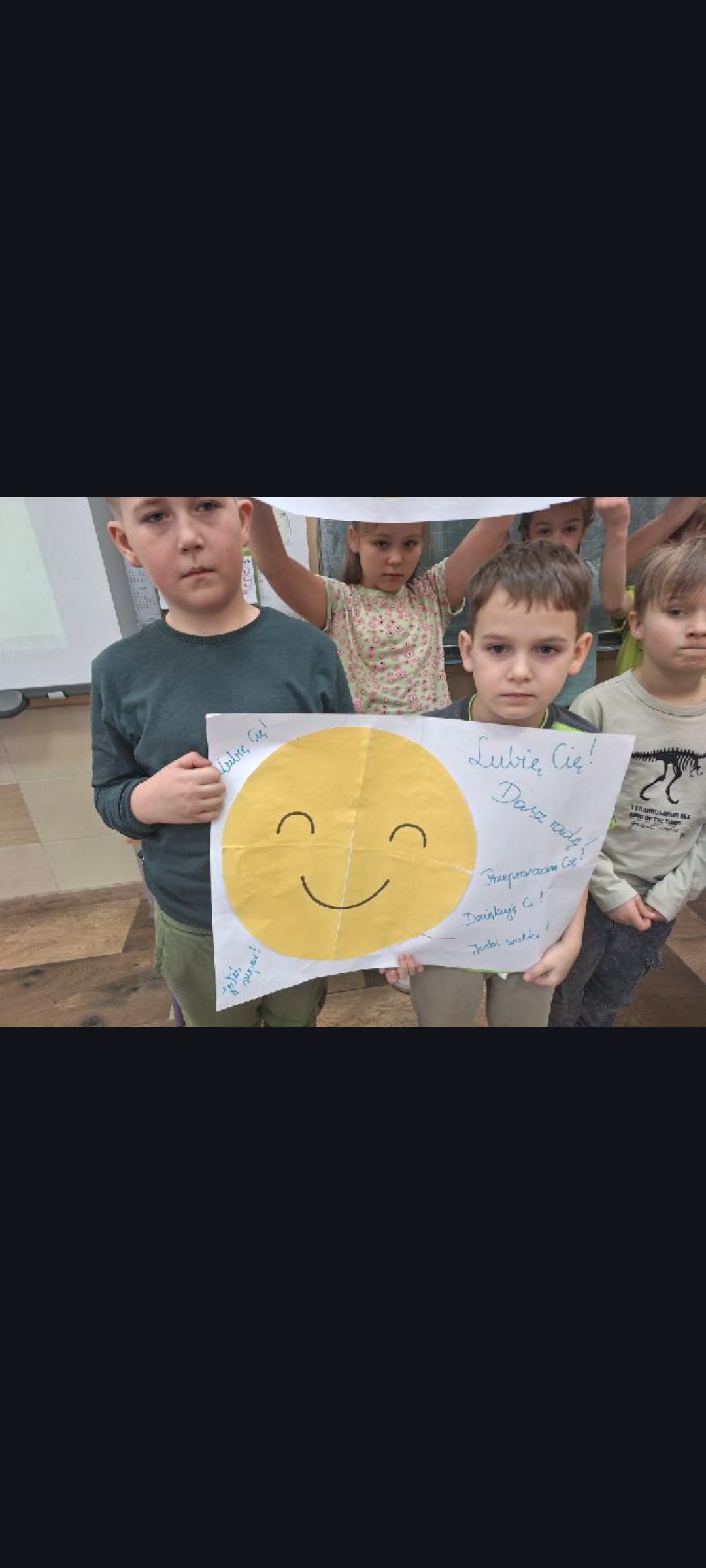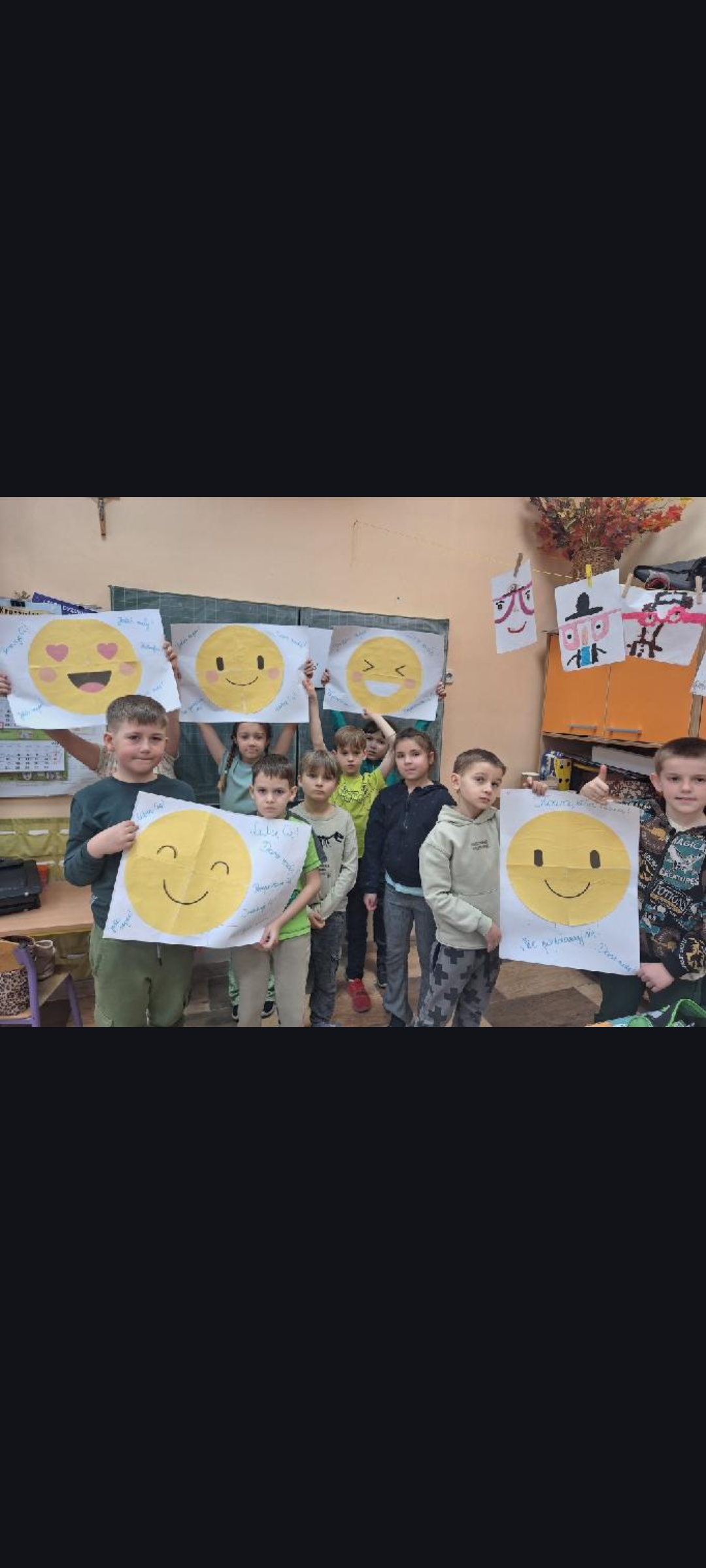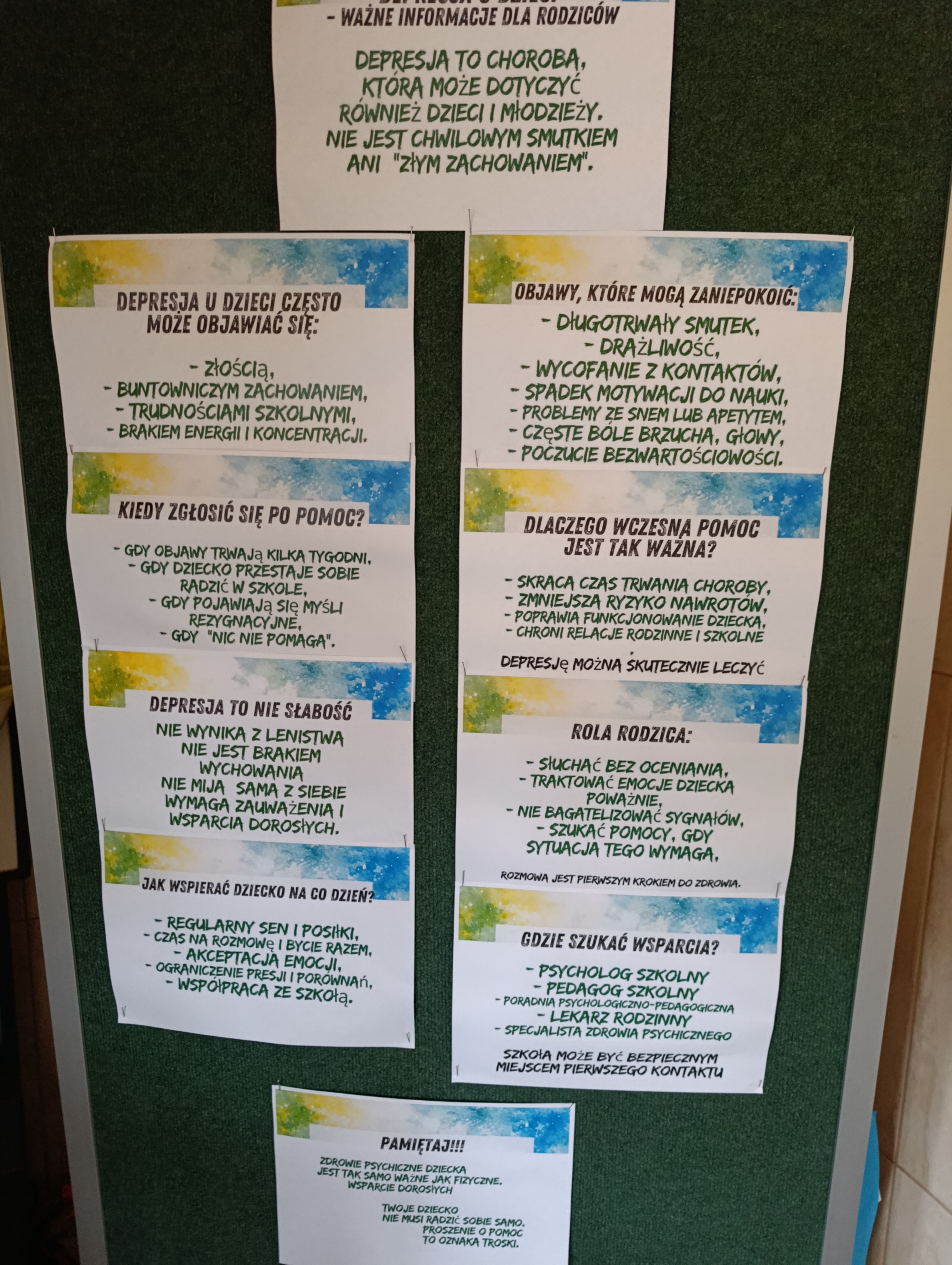 Na szkolnym korytarzu pojawiła się gazetka tematyczna zawierająca podstawowe informacje dla uczniów i rodziców czym jest depresja, gdzie szukać pomocy. Uczniowie mogli wylosować ,,pozytywne myśli", krótkie, wspierające zdania dodające otuchy, np. ,,Nie jesteś sam", ,,Twoje uczucia są ważne ". Na korytarzach i w klasach pojawiły się również hasła promujące życzliwość, empatię i troskę o zdrowie psychiczne. Stworzyliśmy symboliczną ,,Chmurę wsparcia", na której uczniowie mogli zapisywać słowa otuchy, dobre myśli i komunikaty wzmacniające dla swoich koleżanek i kolegów. Powstała przestrzeń pozytywnych emocji, pokazująca, jak ważne jest wzajemne wsparcie.
