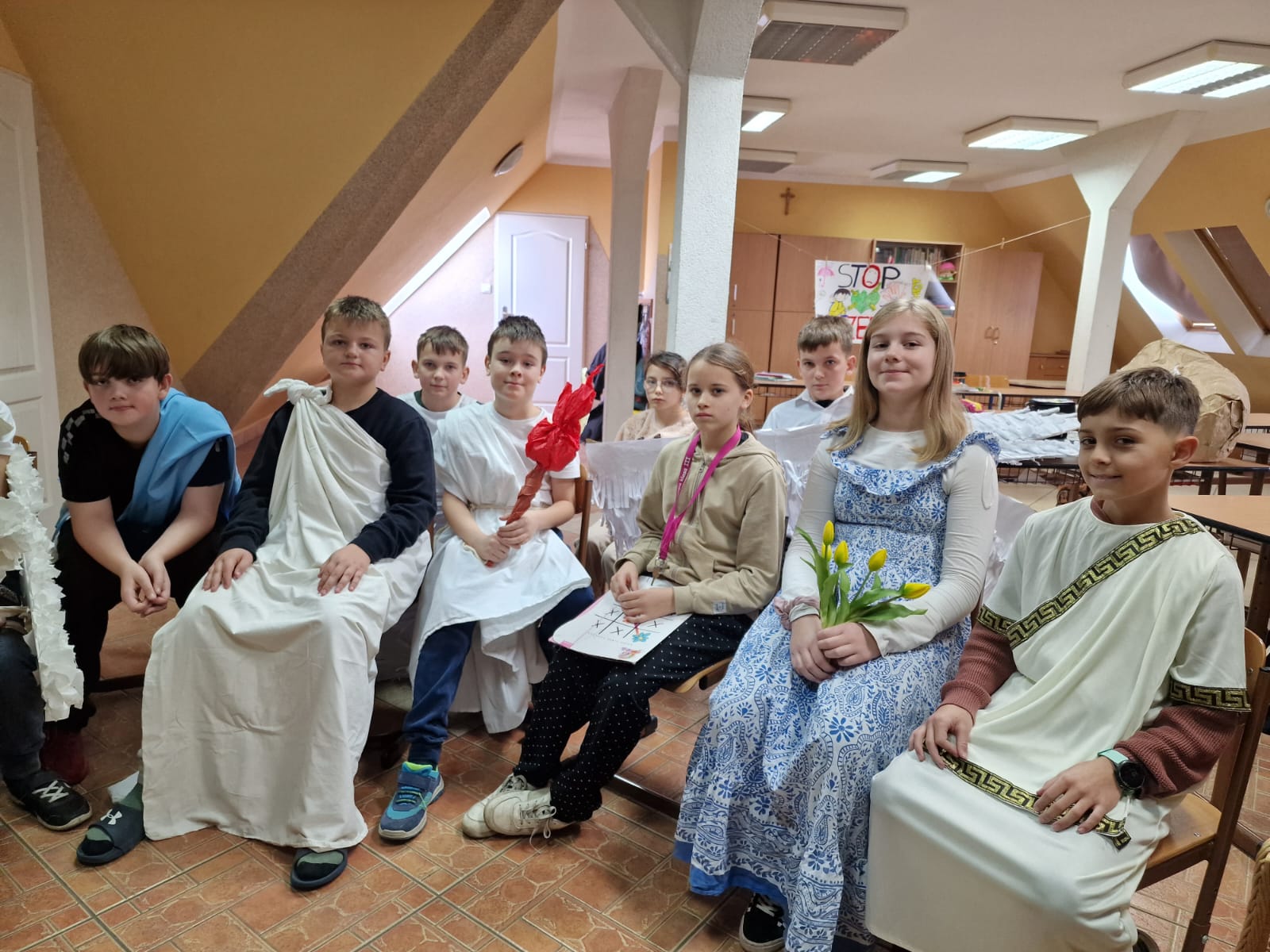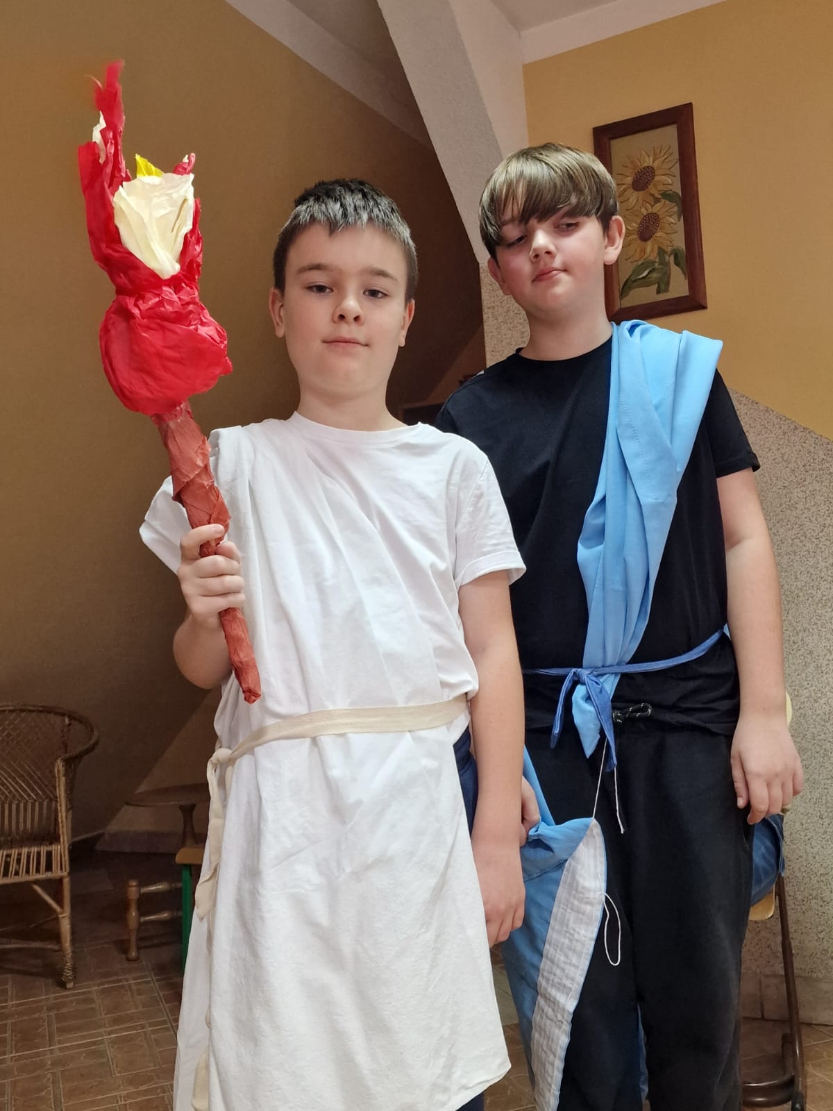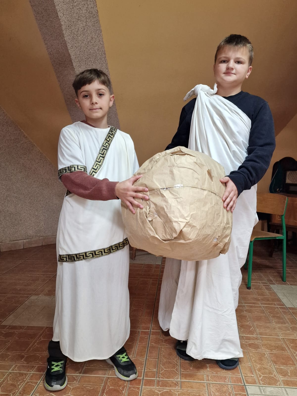 27. listopada na lekcji jÄ™zyka polskiego opuÅ›ciliÅ›my szkolne Å‚awki, zasiedliÅ›my w póÅ‚okrÄ™gu i z zaciekawieniem sÅ‚uchaliÅ›my prezentacji koleżanek i kolegów, którzy wcielili siÄ™ w bohaterów omówionych mitów. Rekwizyty i stroje pomogÅ‚y nam upodobnić siÄ™ do prezentowanych postaci. Sztuka wystÄ™powania przed publicznoÅ›ciÄ… nie jest wcale taka Å‚atwa, dlatego każdy wystÄ™p nagrodziliÅ›my brawami.