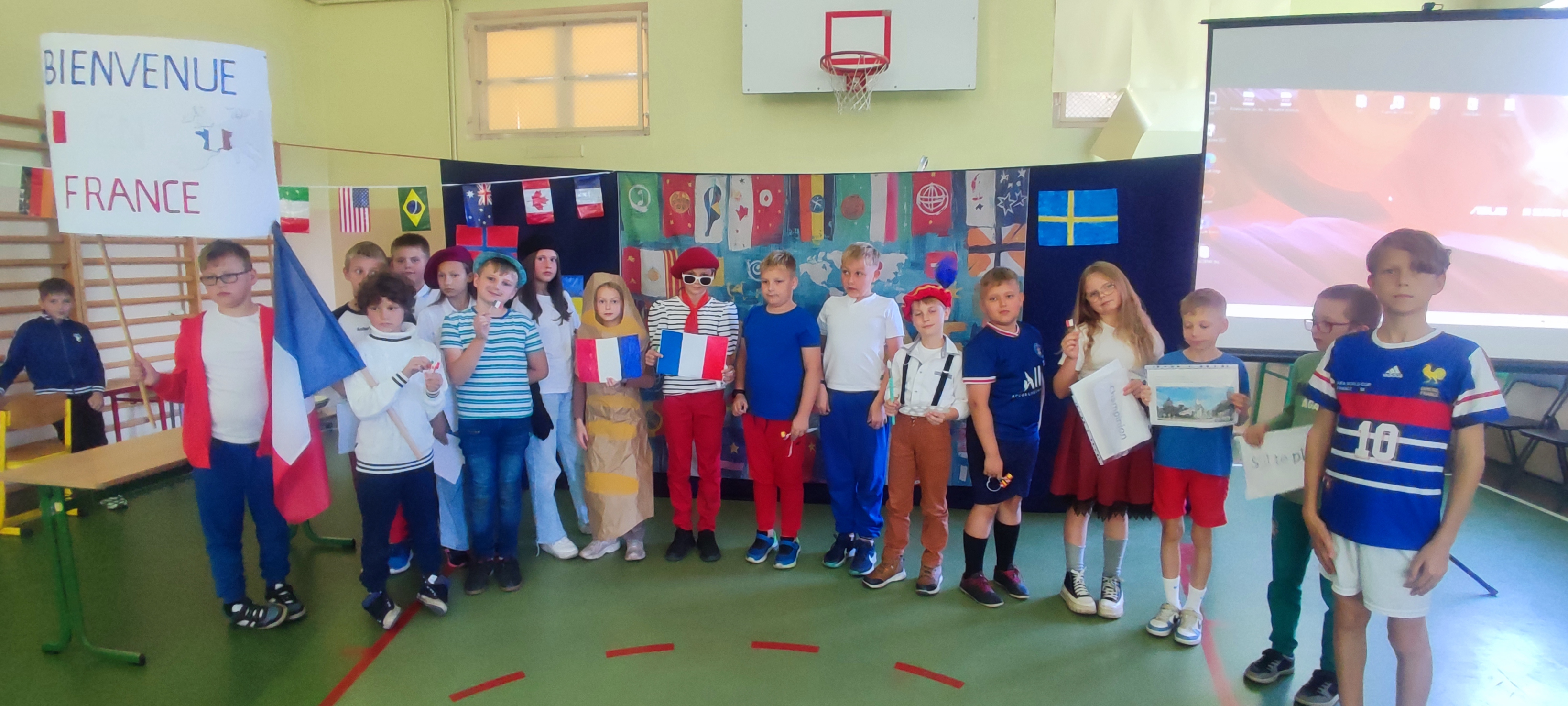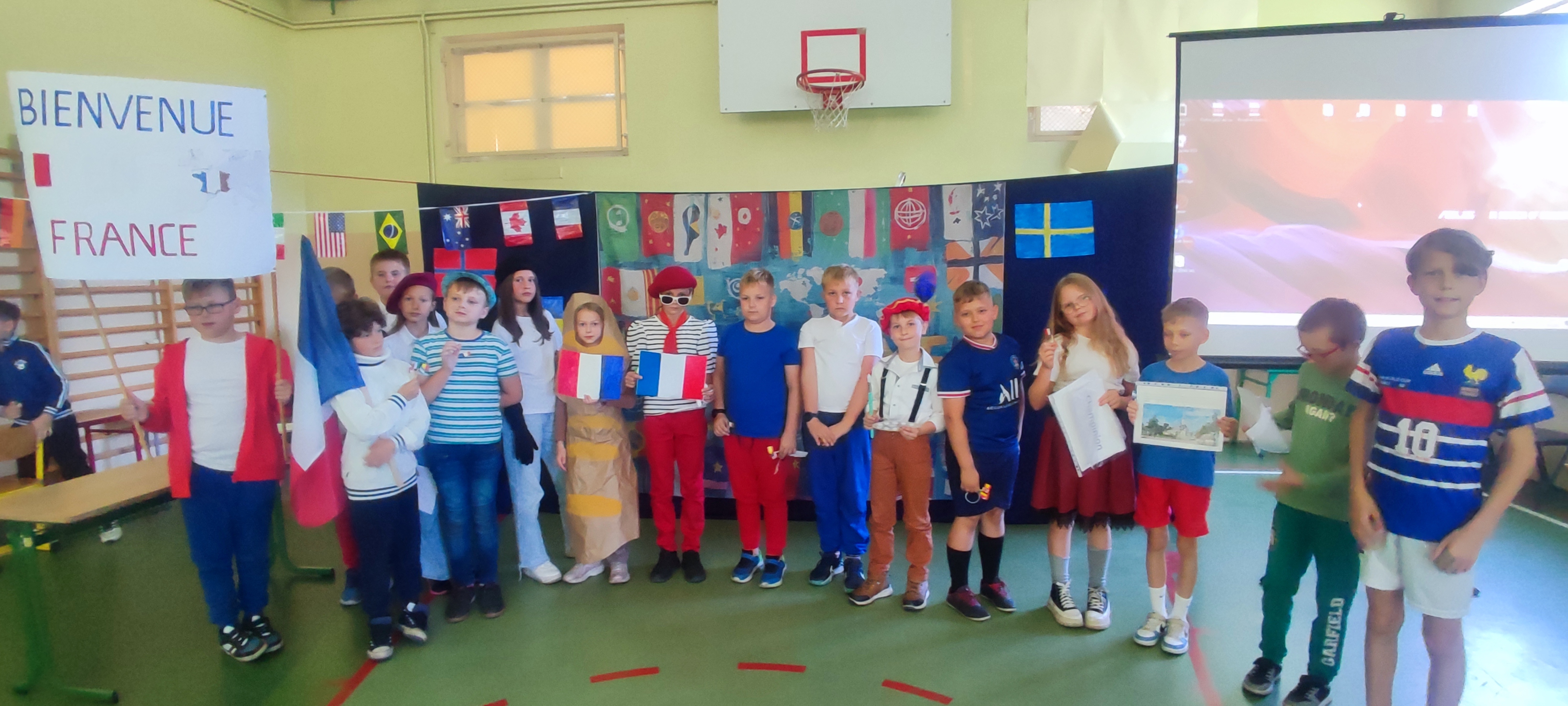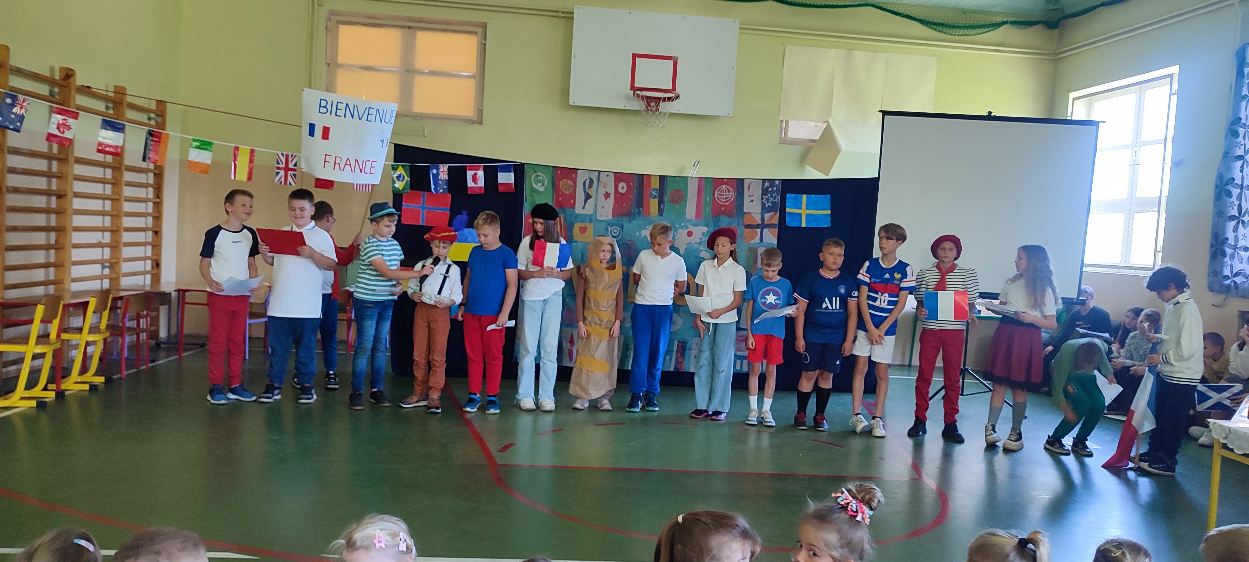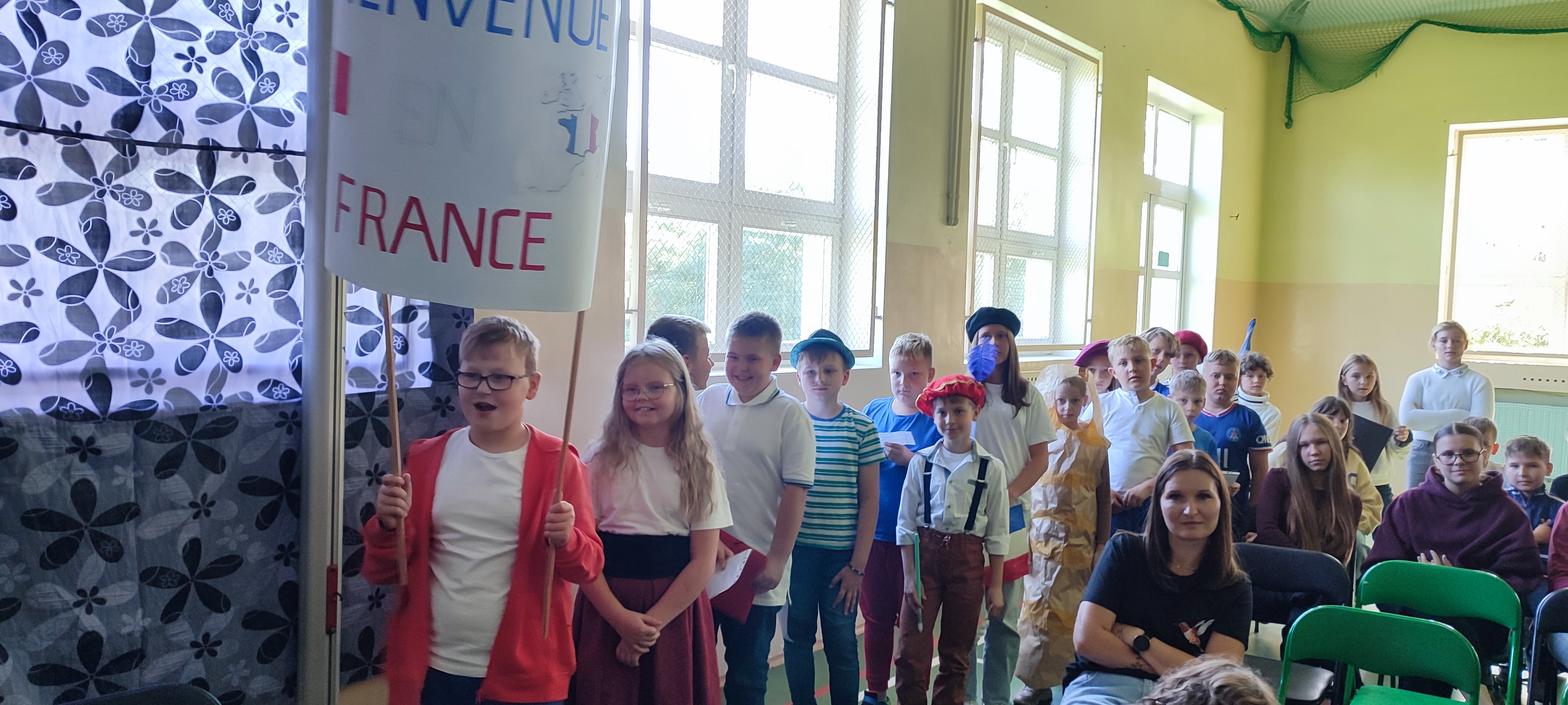 W naszej szkole 25 września obchodziliśmy Światowy Dzień Języków Obcych. Nasza klasa przygotowała prezentację oFrancji. Na sali pojawił się duży transparent z napisem Bienvenue en France („Witamy we Francji”).