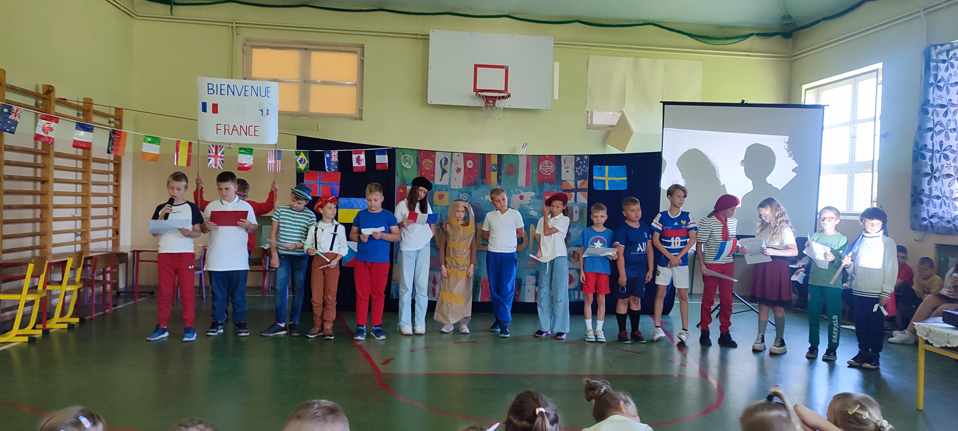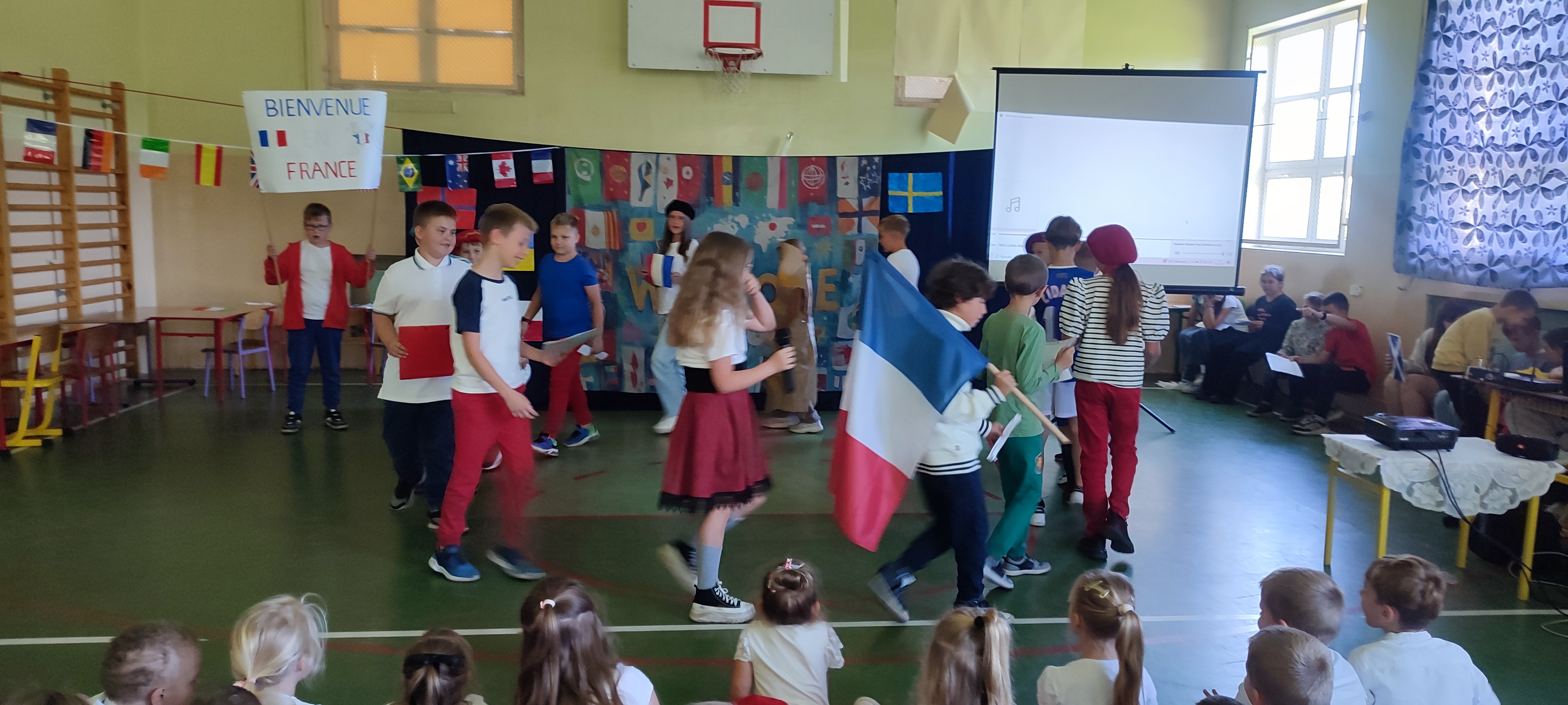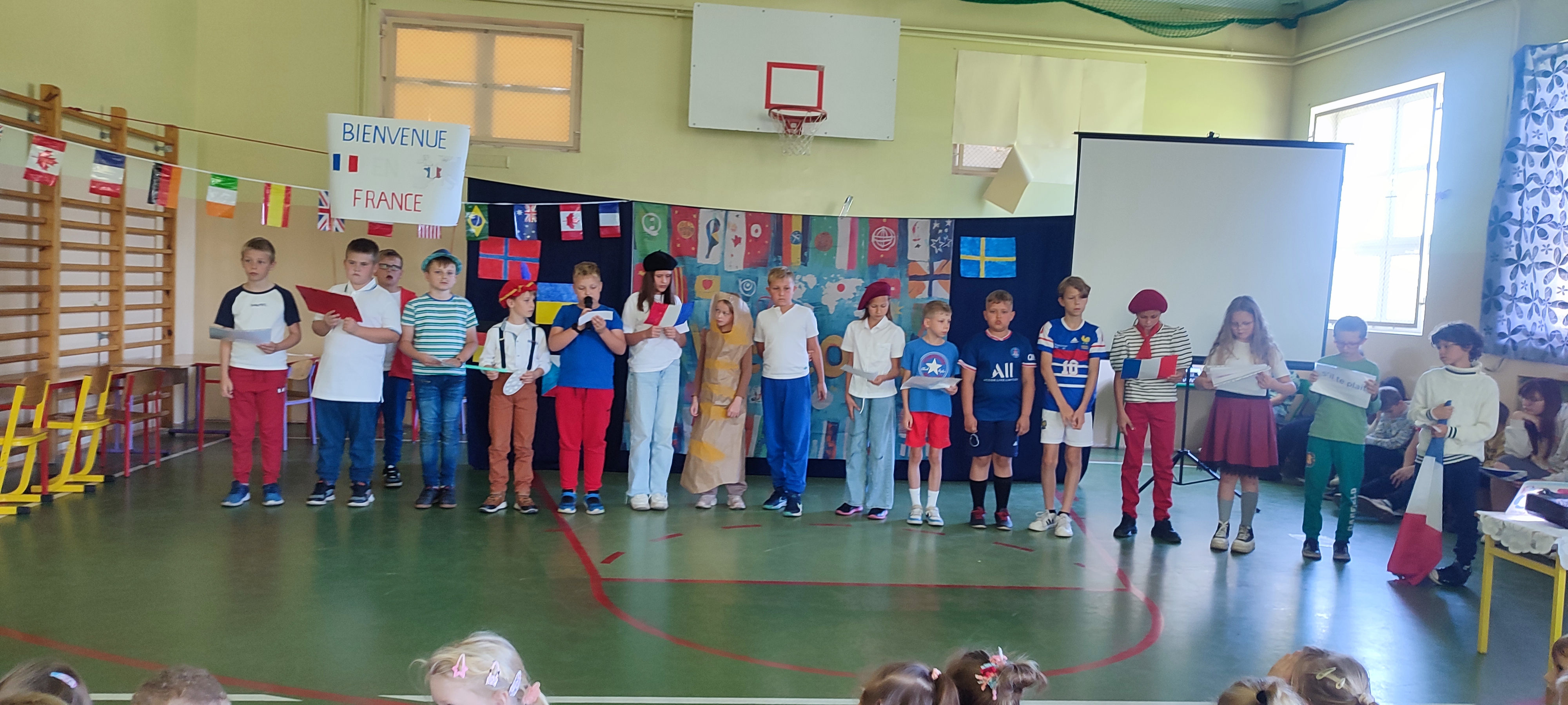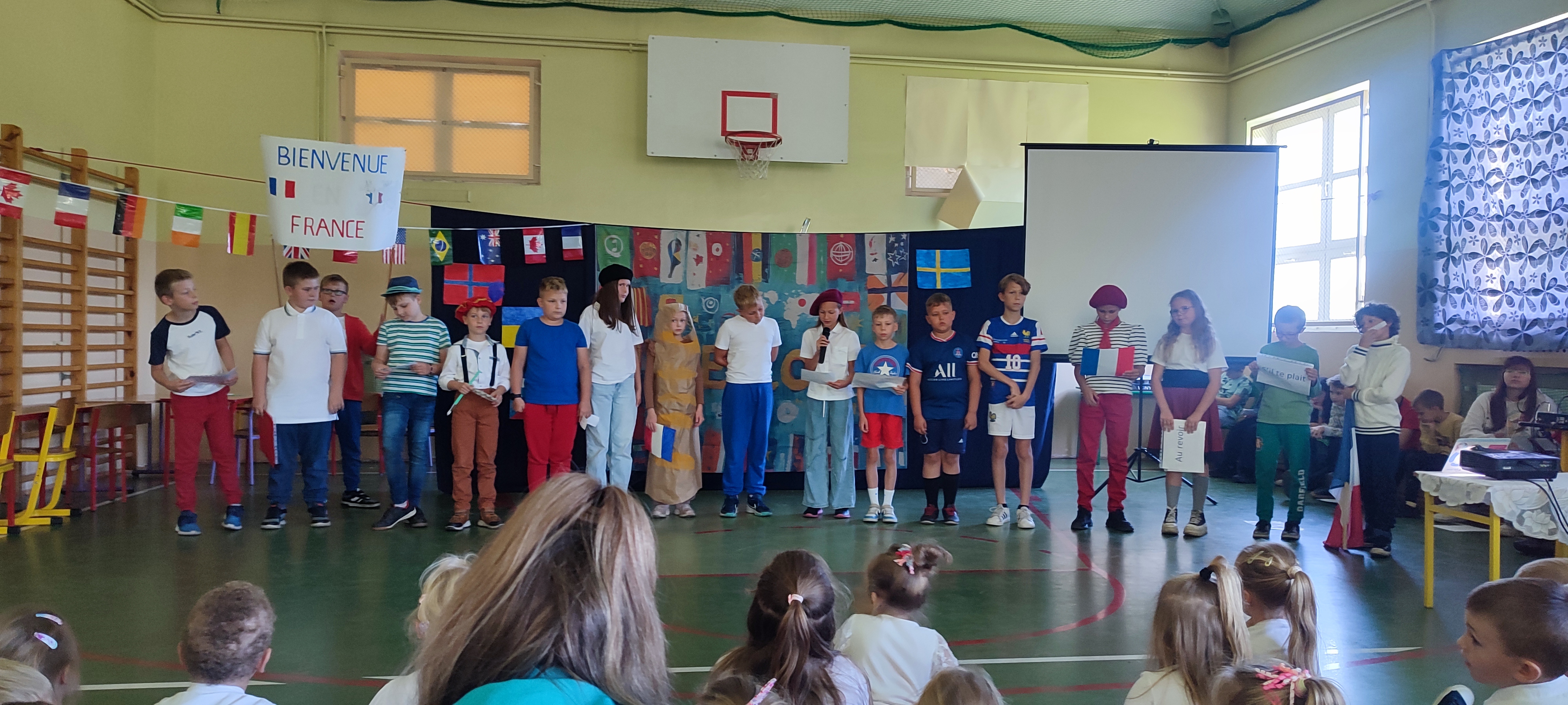 W naszej szkole 25 września obchodziliśmy Światowy Dzień Języków Obcych. Nasza klasa przygotowała prezentację oFrancji. Na sali pojawił się duży transparent z napisem Bienvenue en France („Witamy we Francji”).