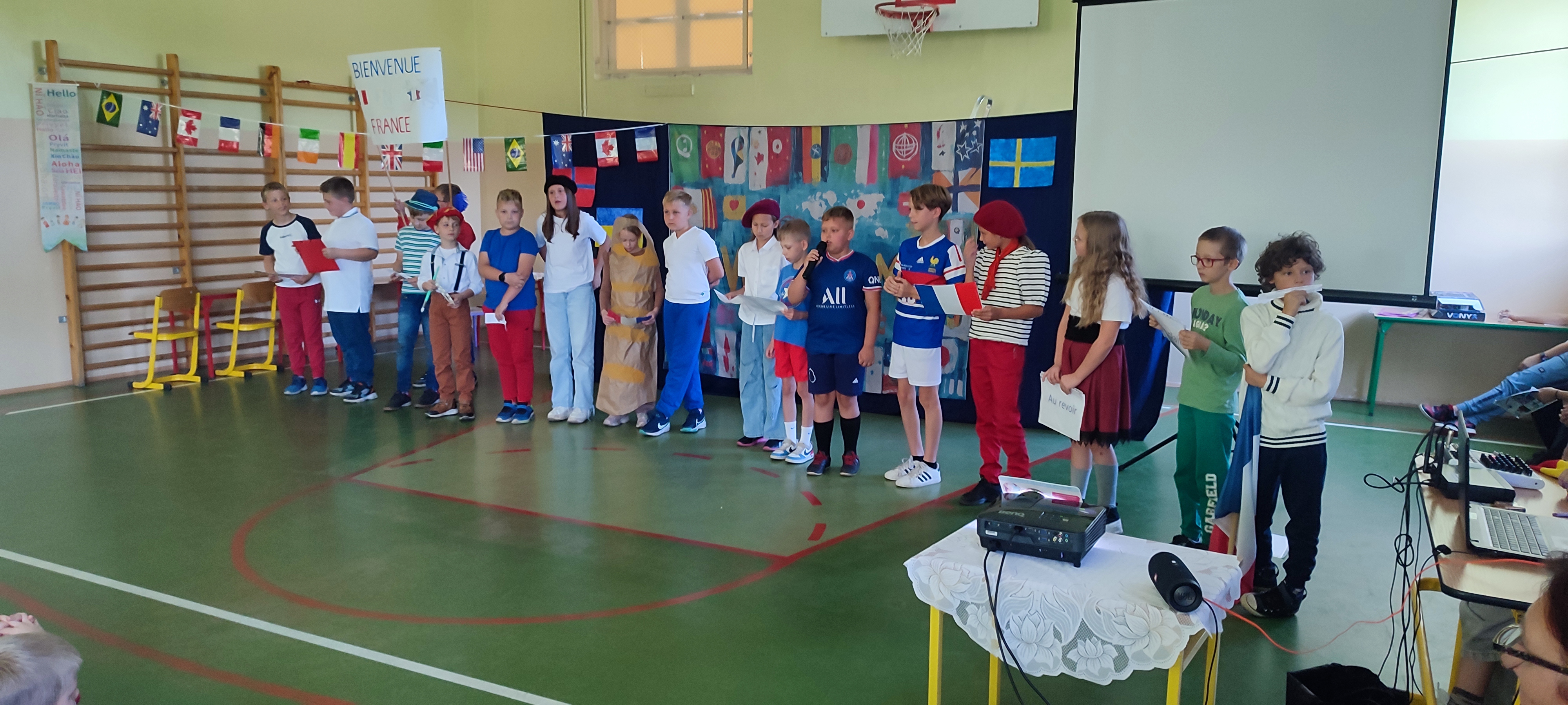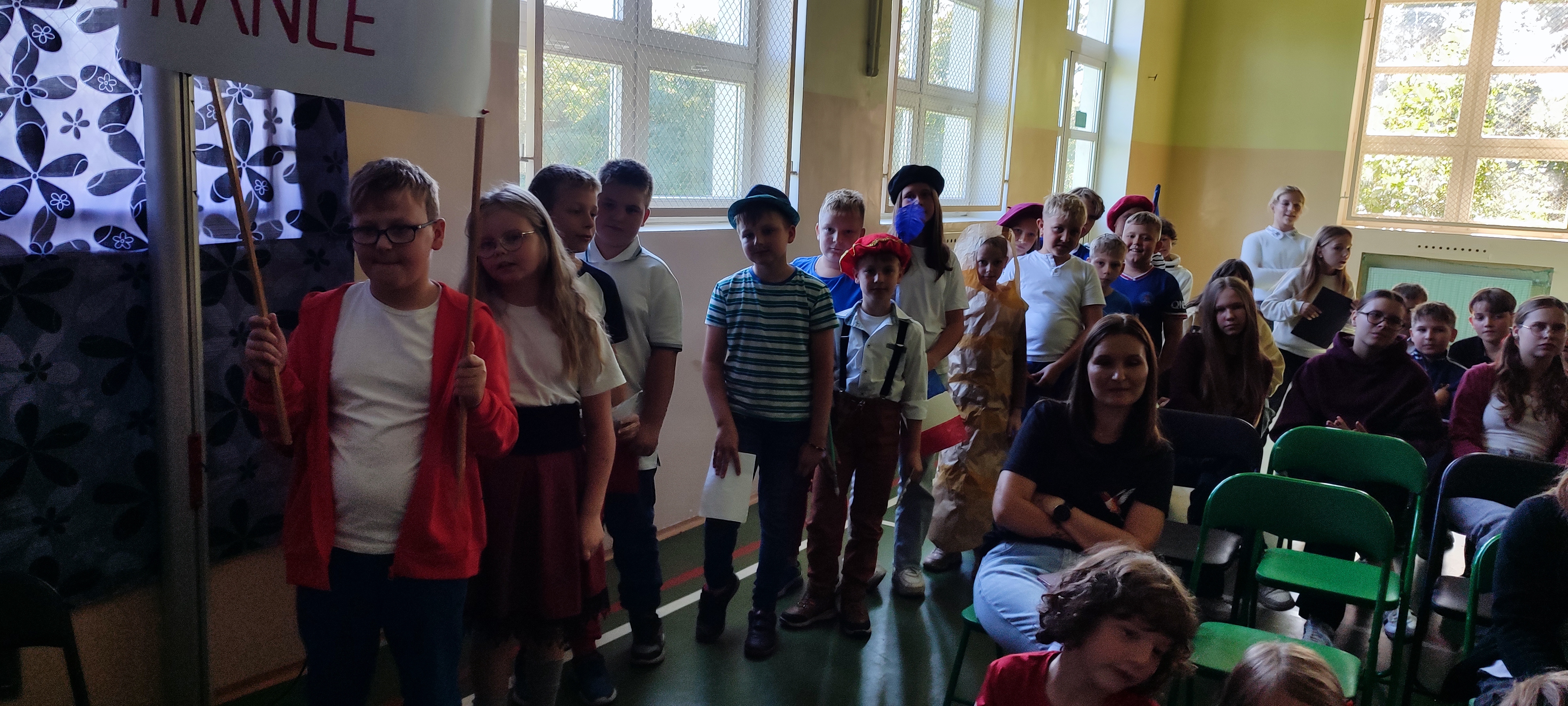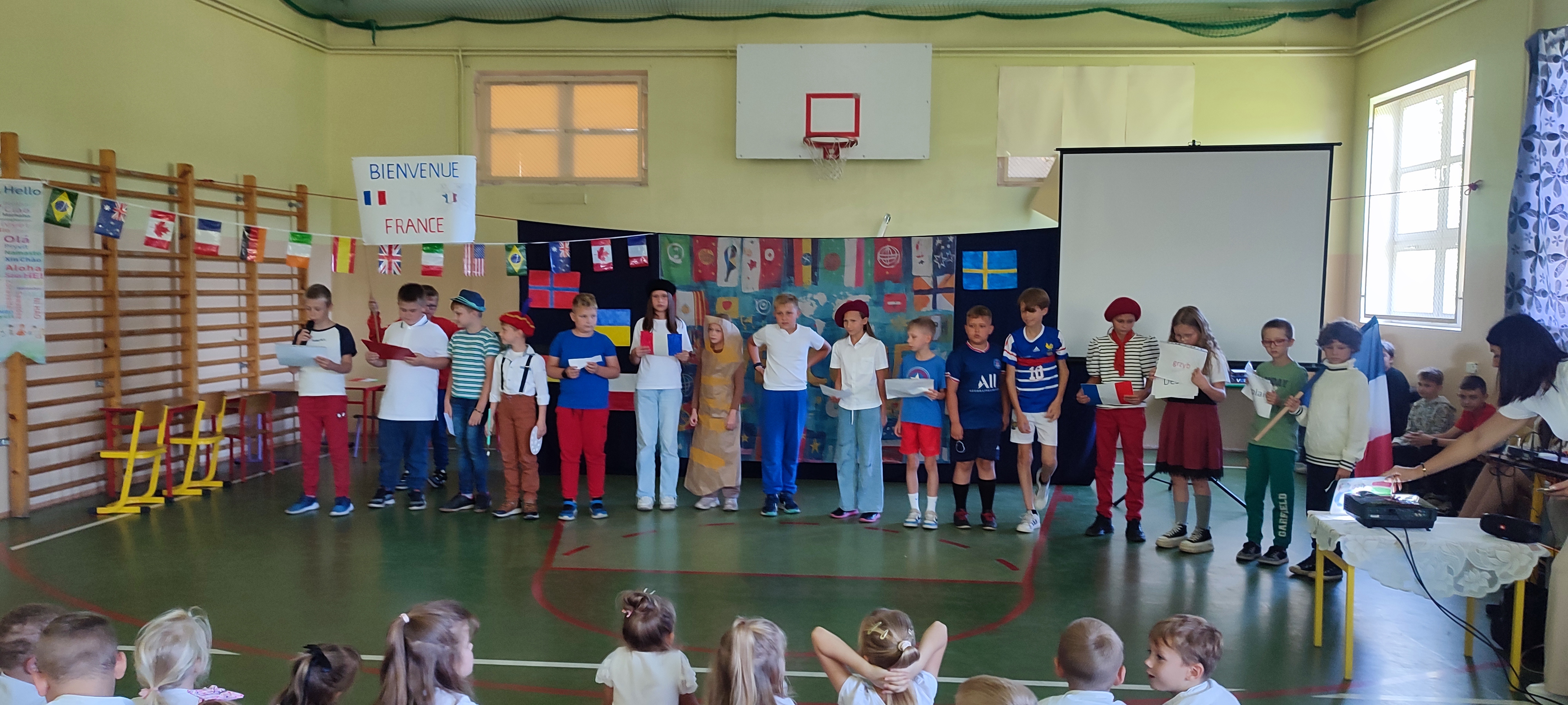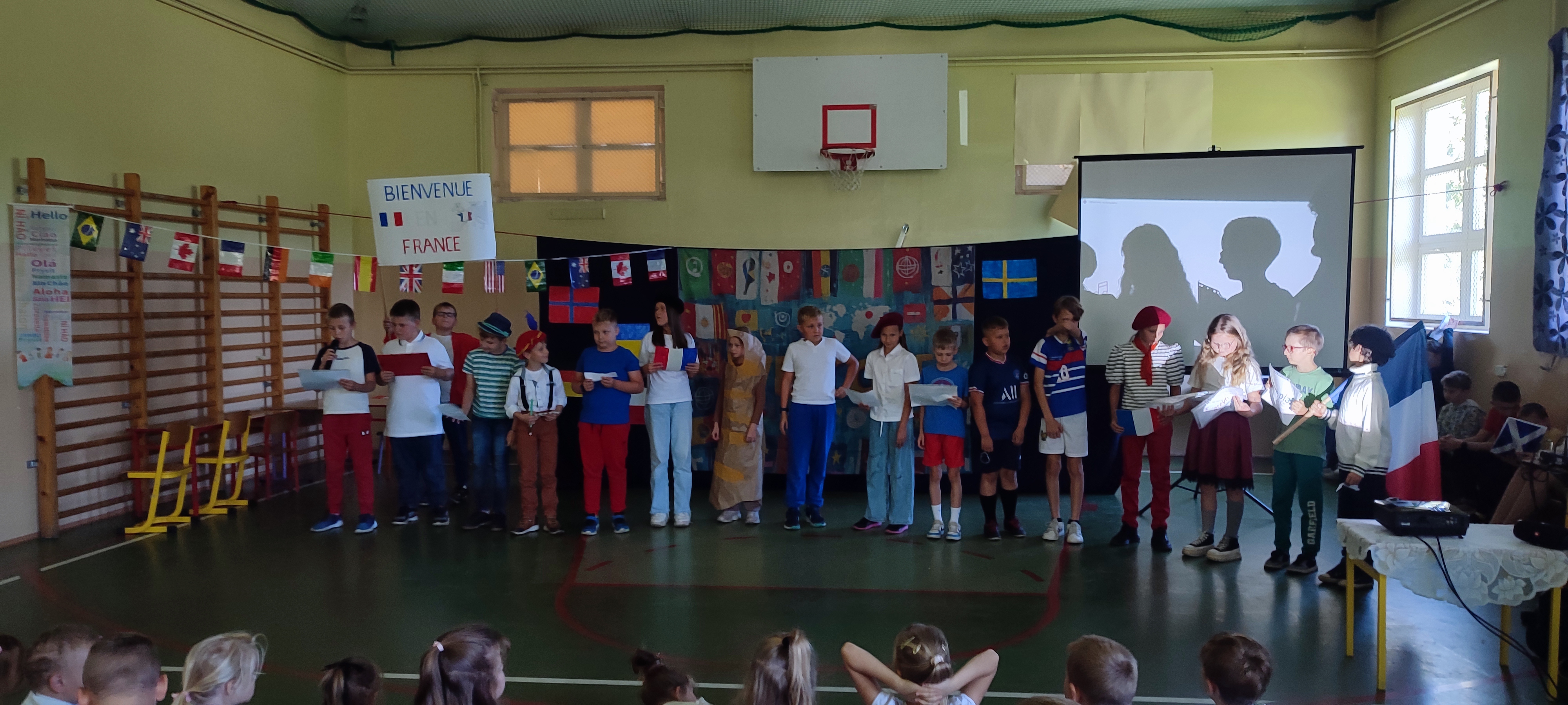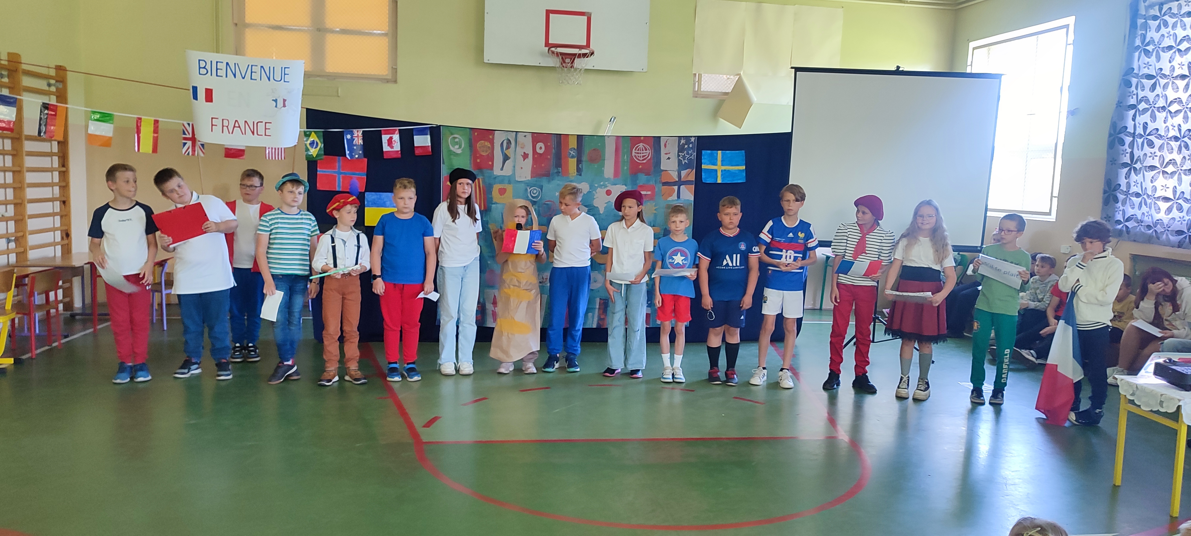 W naszej szkole 25 września obchodziliśmy Światowy Dzień Języków Obcych. Nasza klasa przygotowała prezentację oFrancji. Na sali pojawił się duży transparent z napisem Bienvenue en France („Witamy we Francji”).