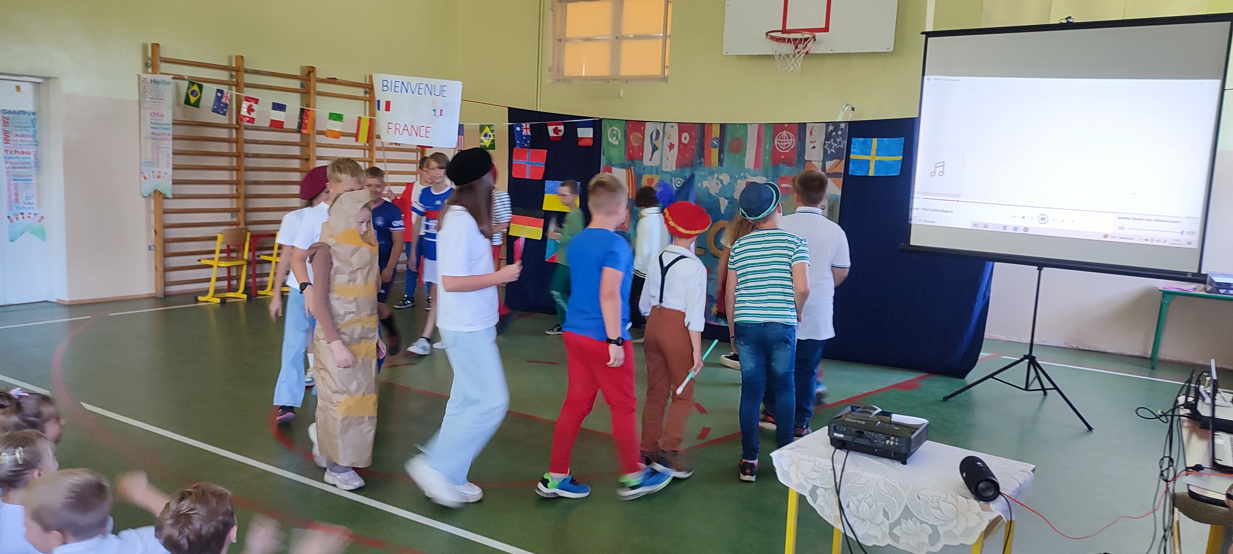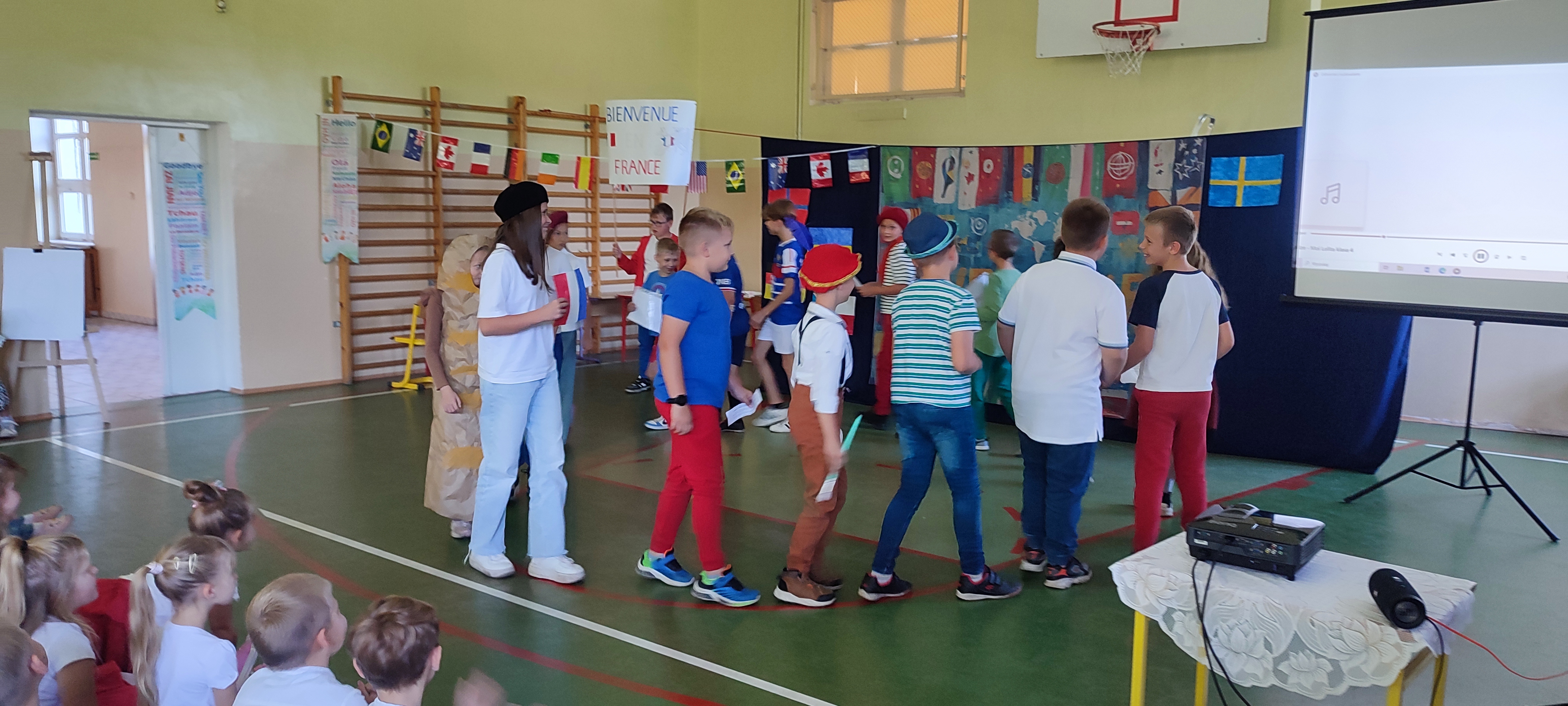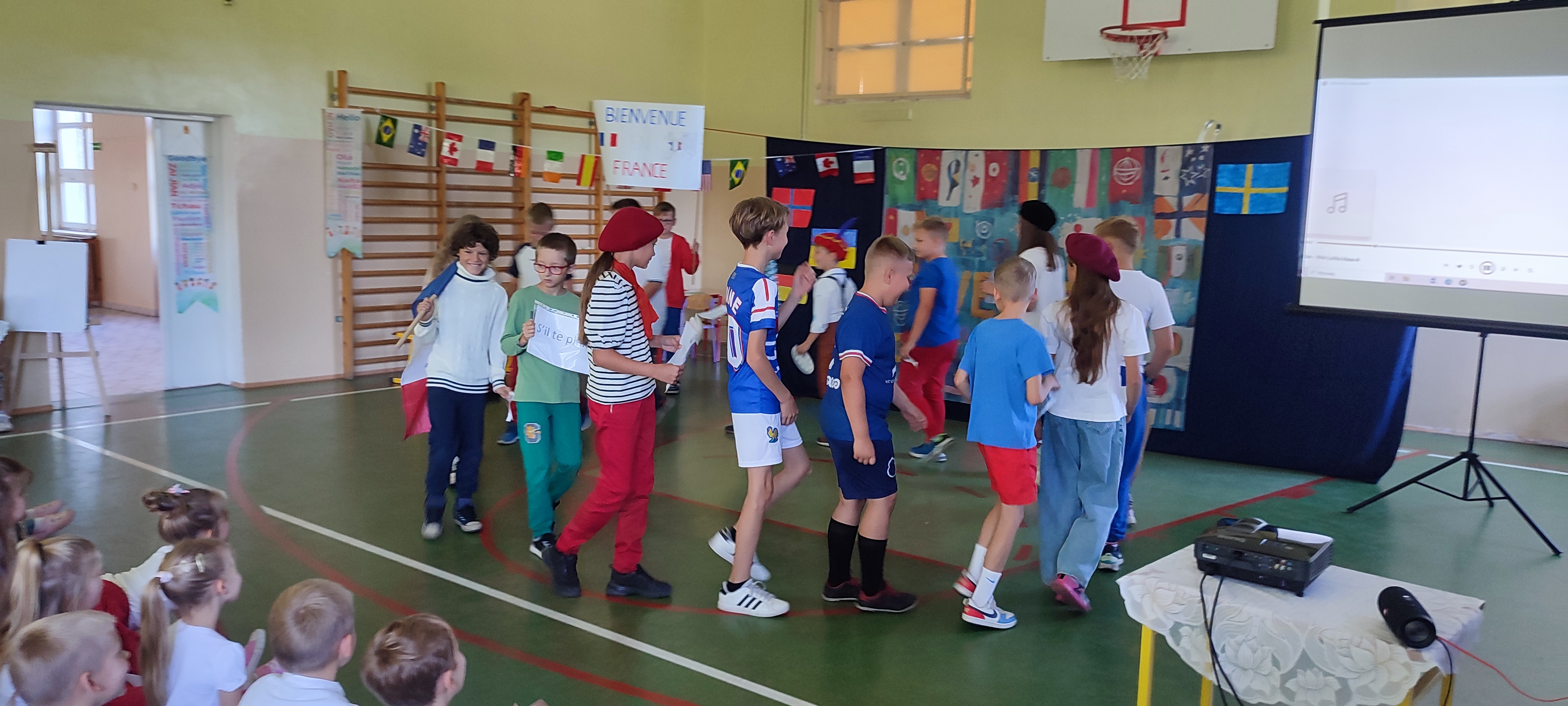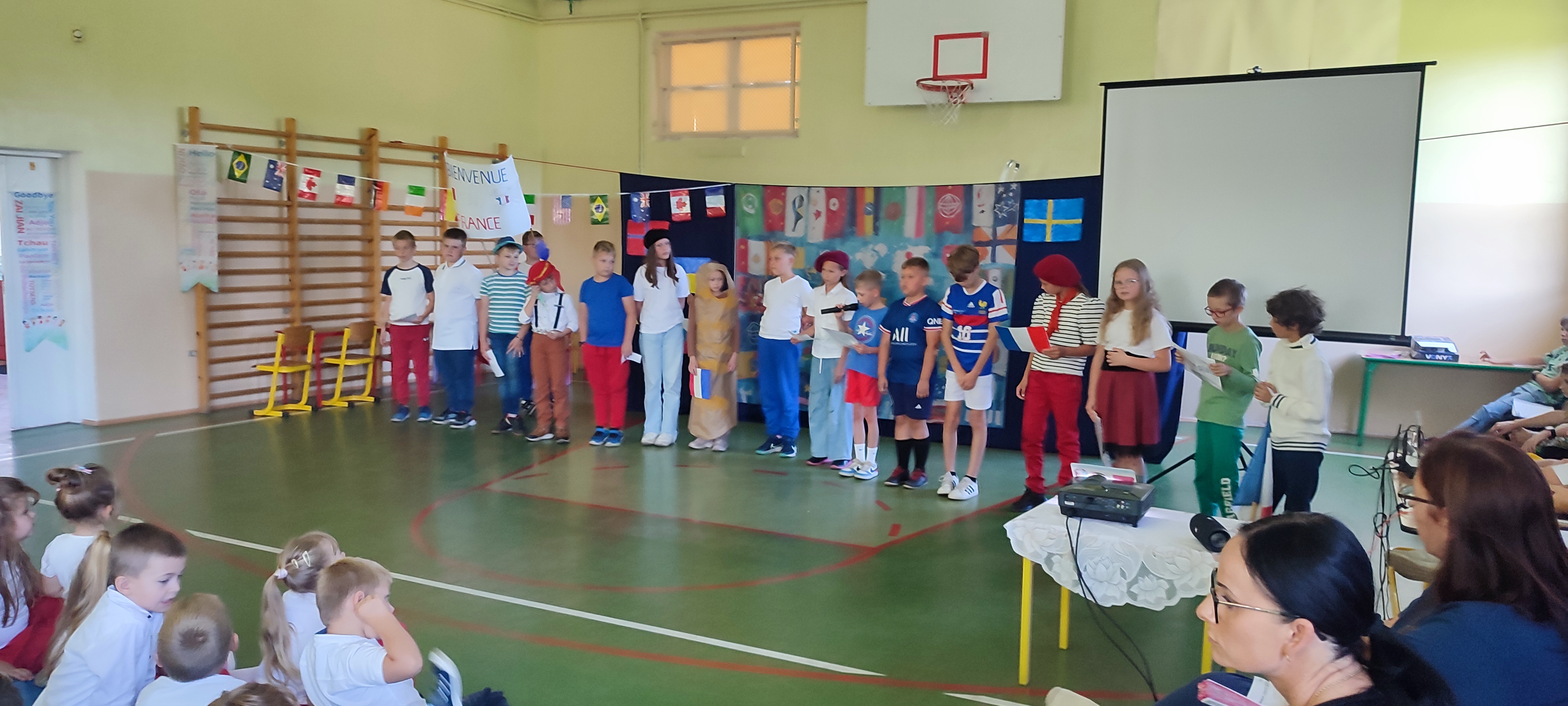 W naszej szkole 25 września obchodziliśmy Światowy Dzień Języków Obcych. Nasza klasa przygotowała prezentację oFrancji. Na sali pojawił się duży transparent z napisem Bienvenue en France („Witamy we Francji”).