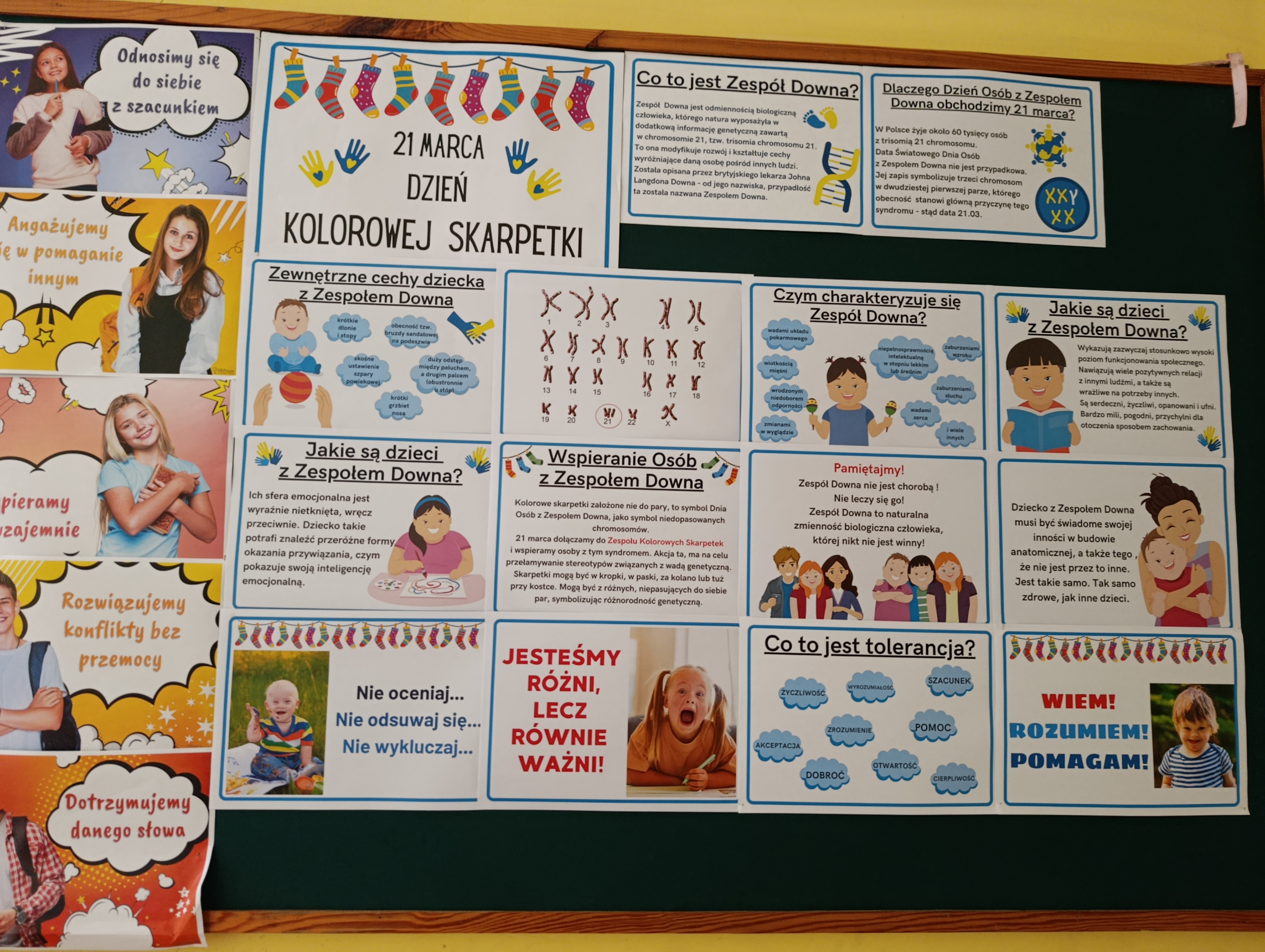 W ramach obchodów przeprowadzono szereg działań edukacyjnych i integracyjnych. Odbyły się pogadanki przybliżające tematykę, a także projekcje filmów edukacyjnych, które pomogły uczniom lepiej zrozumieć codzienne wyzwania osób z spektrum i z zespołem Downa. Pedagog i psycholog szkolny przygotowali tematyczną gazetkę informacyjną, zawierającą ciekawostki i ważne wskazówki dotyczące budowania empatii. Dużym zainteresowaniem cieszyła się również wystawa prac plastycznych oraz kreatywne warsztaty projektowania kolorowych skarpetek, podczas których mogli wyrazić swoje pomysły i wrażliwość artystyczną.