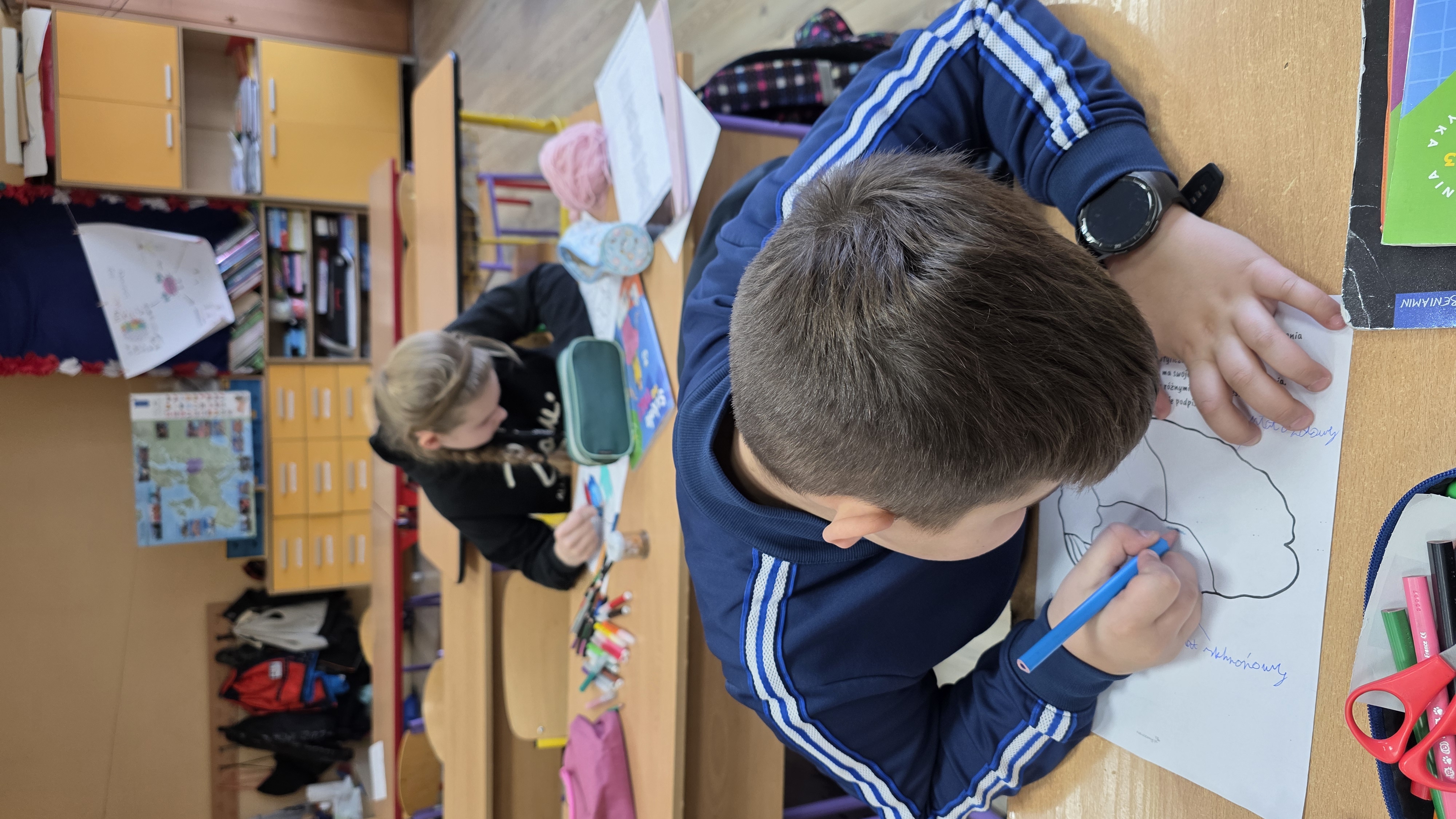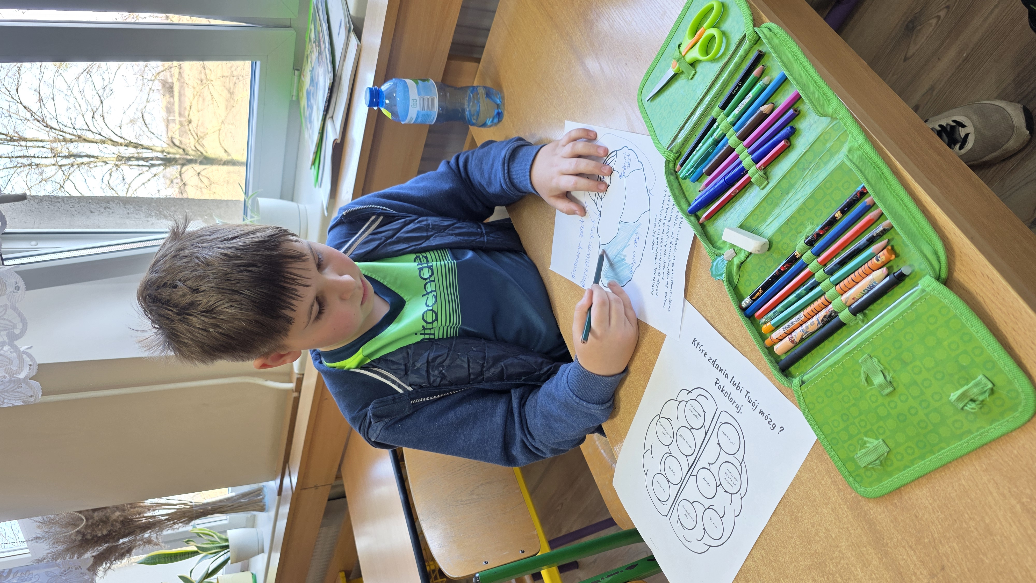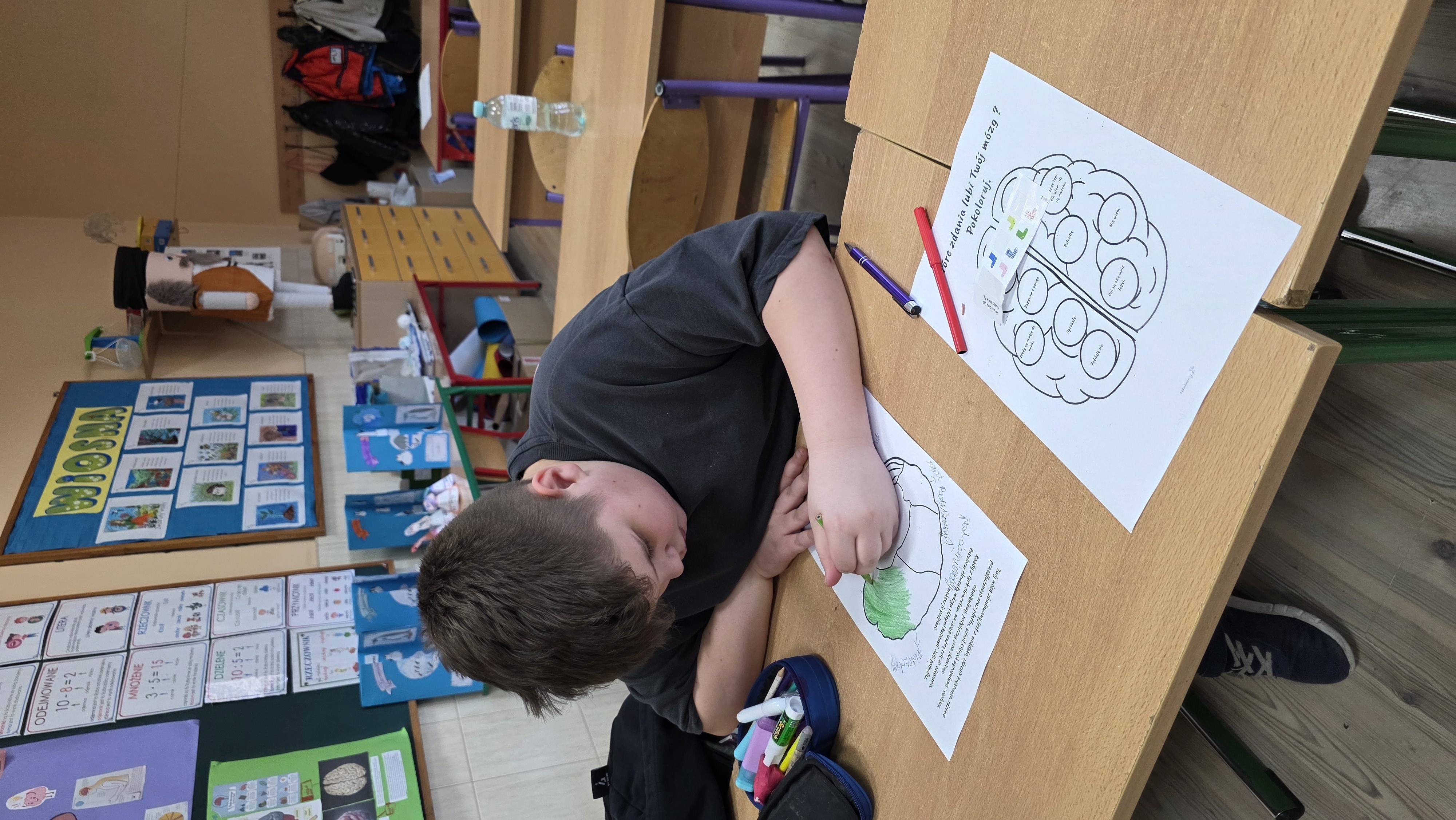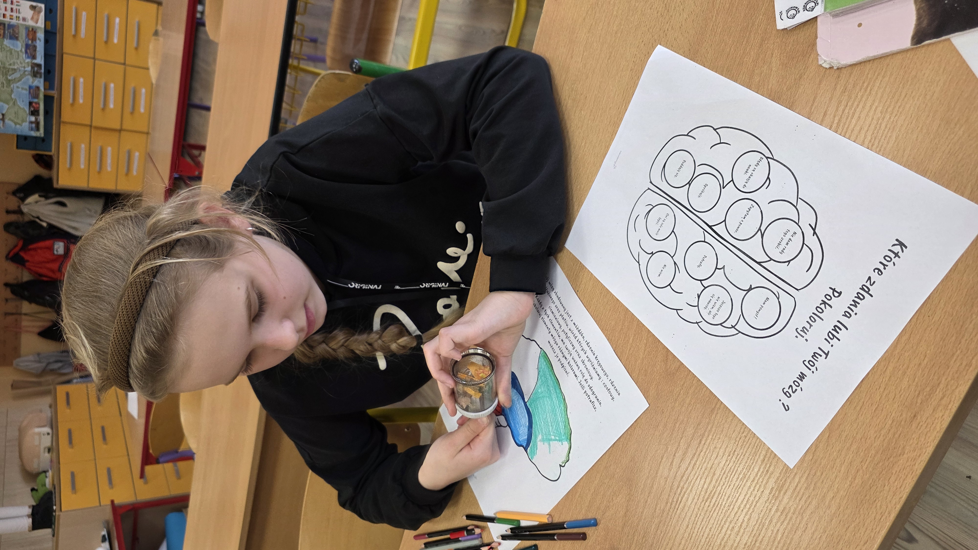 Podczas zajęć uczniowie poznawali również budowę mózgu - opisywali poszczególne płaty mózgowe oraz ich funkcje, a także utrwalali wiedzę poprzez kolorowanie przygotowanych materiałów edukacyjnych. Dodatkowo zaznaczali hasła i zdania, które "lubi mózg", ucząc się, jak dbać o prawidłowe jego funkcjonowanie.