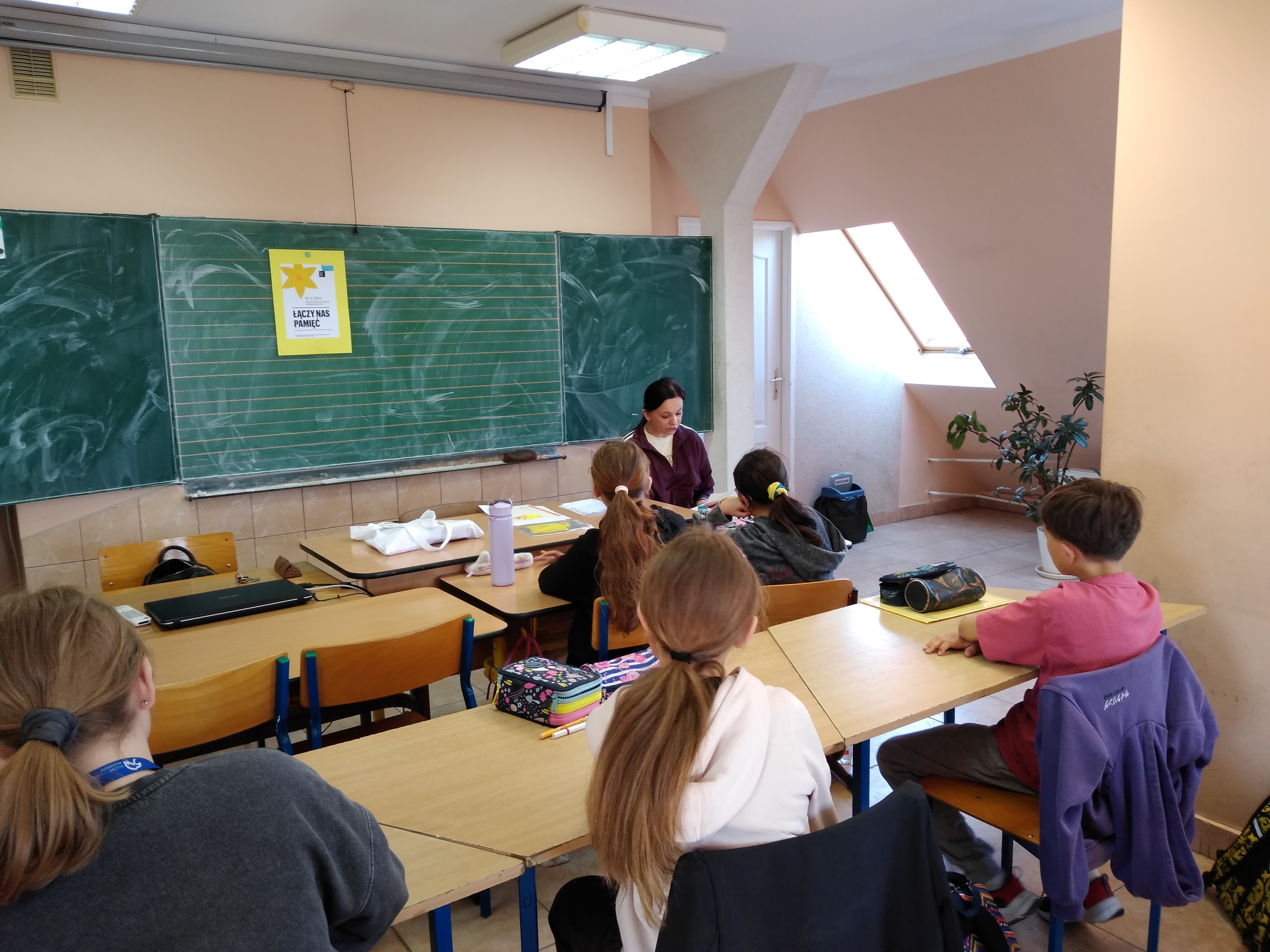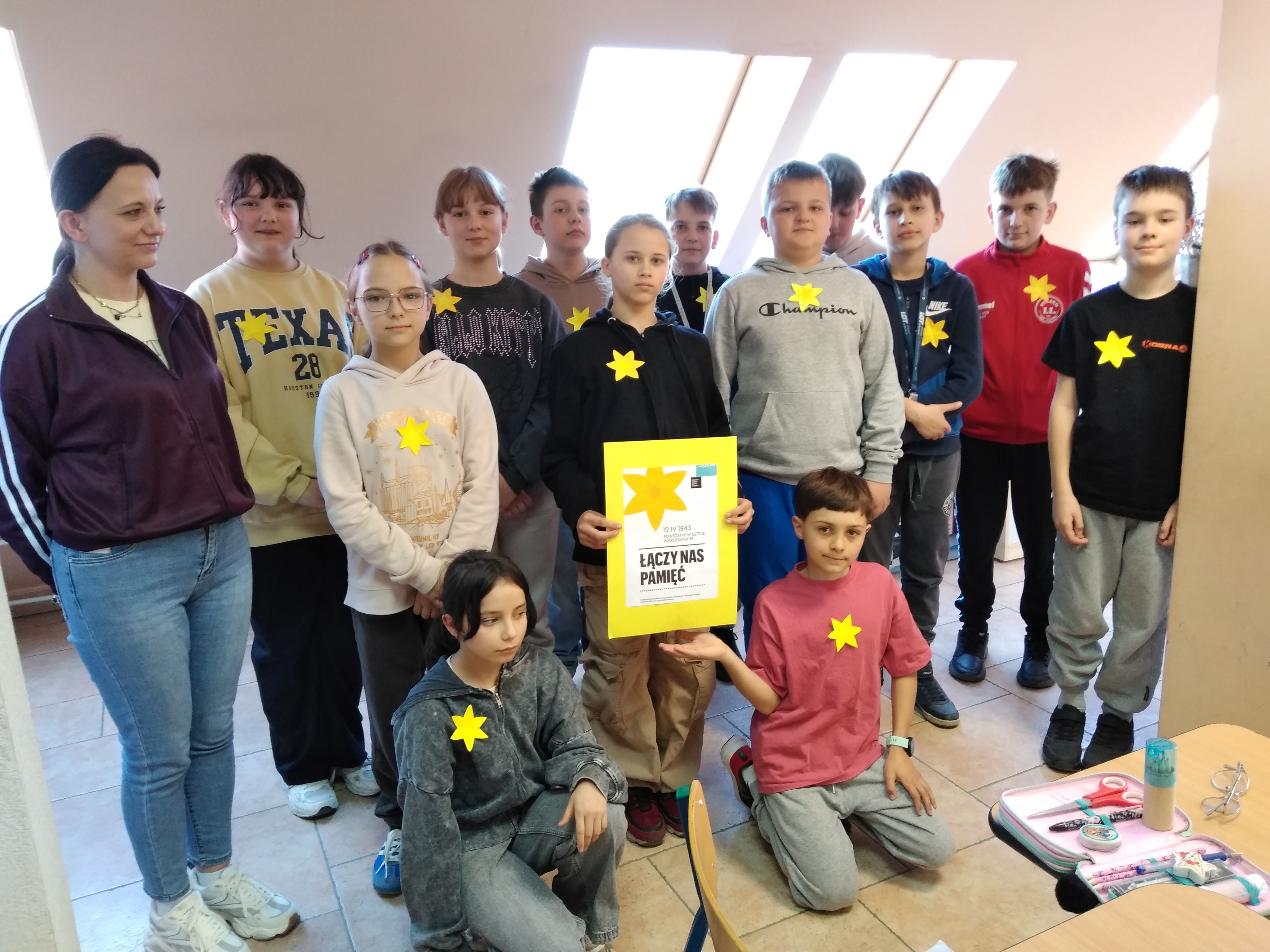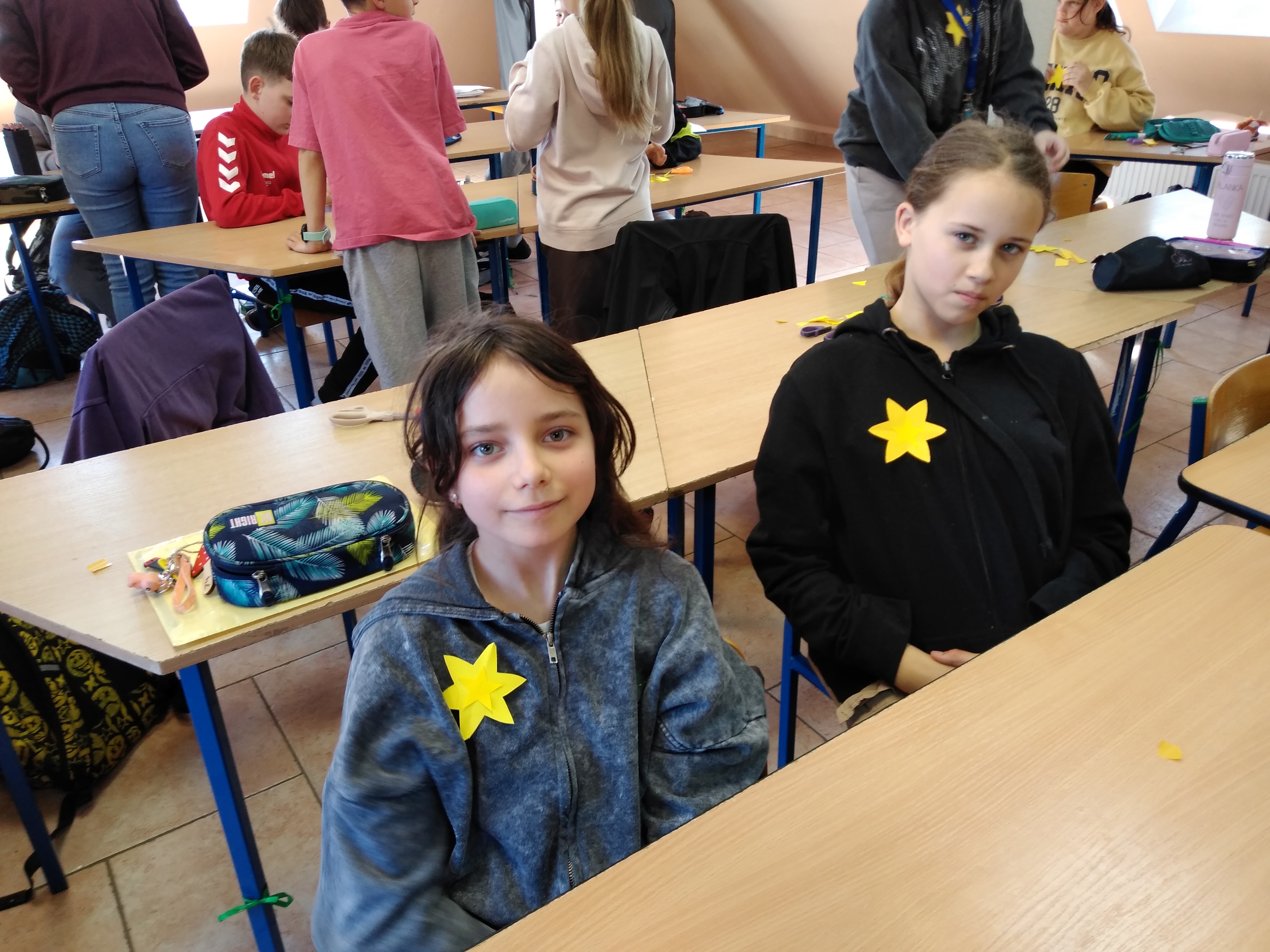 17 kwietnia br. uczniowie klasy 5 spotkali się z pracownikiem biblioteki p. Pauliną Woźniak. Celem spotkania był udział w akcji społeczno-edukacyjnej „Żonkile 2026”. Uczniowie poznali historię powstania w warszawskim getcie, rozmawiali o szacunku i godności wobec innych ludzi, dyskutowali na temat wysłuchanego tekstu pt. „Prezent”. Później uczniowie wykonali papierowe żonkile, które przyczepione do ubrań dumnie nosili na kolejnych lekcjach i przerwach. U. Kołodziejska