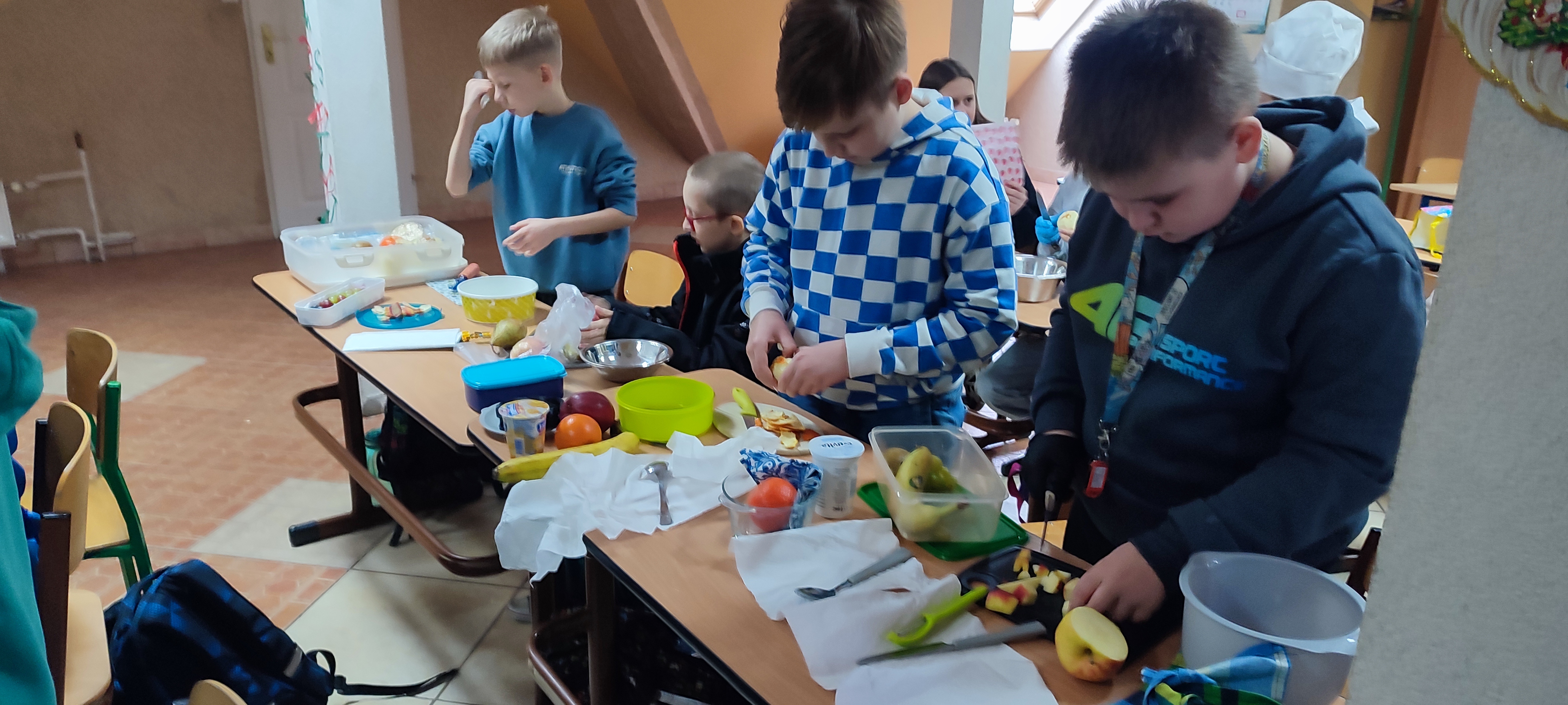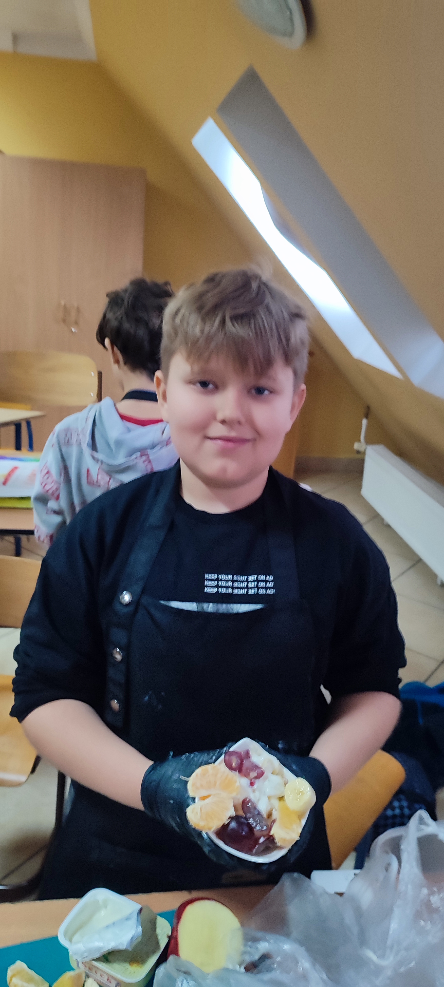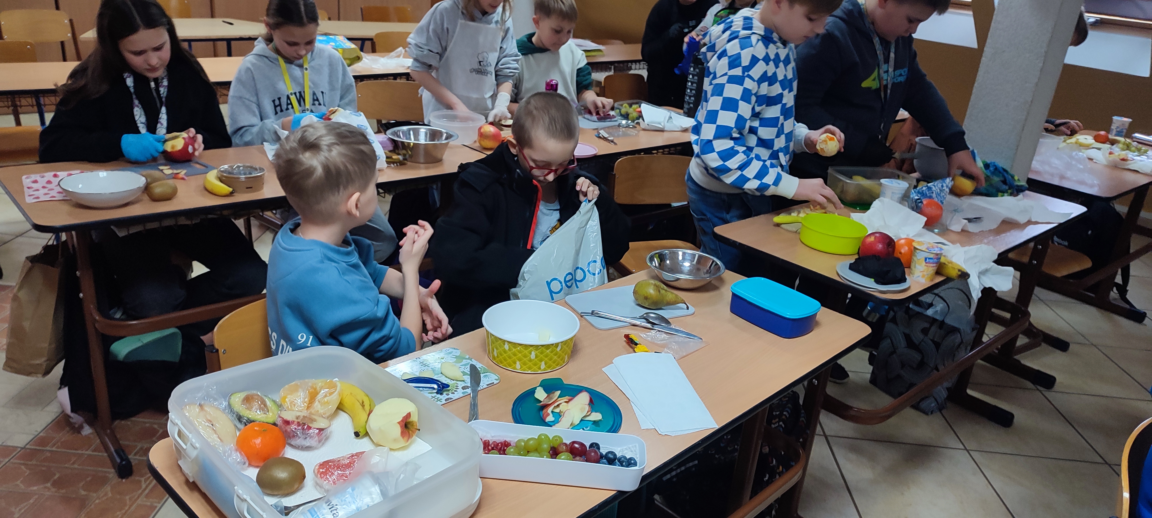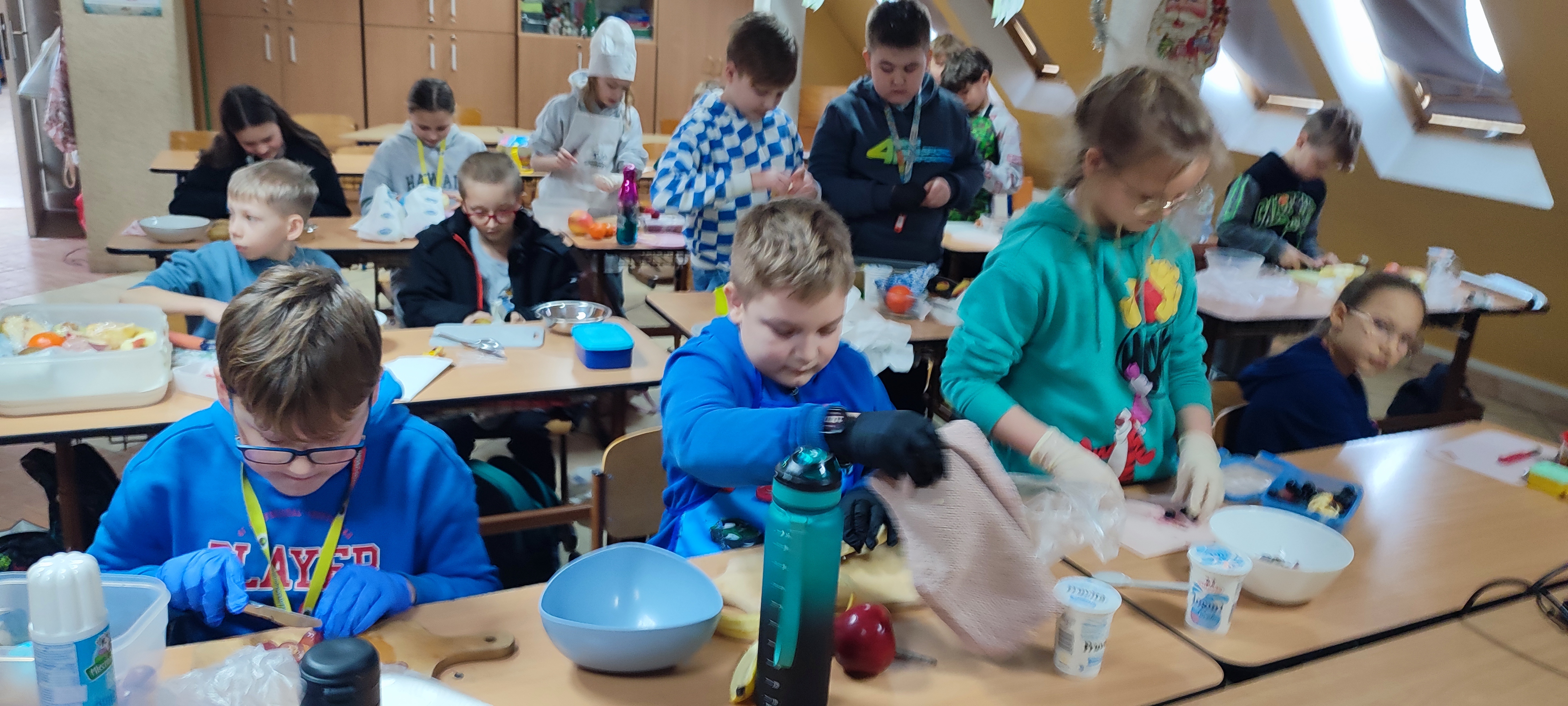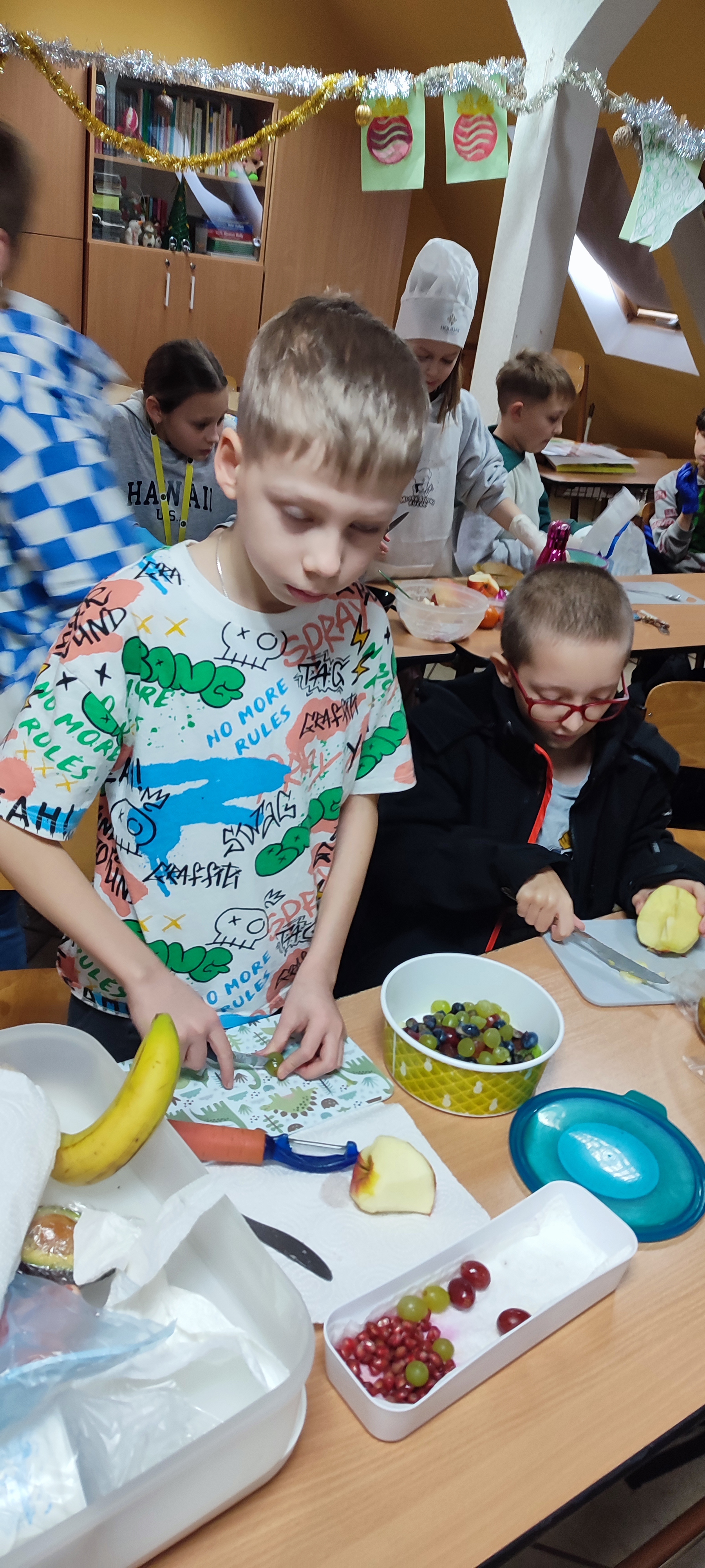 Podczas warsztatów kulinarnych na godzinie wychowawczej uczniowie przygotowali pyszną sałatkę owocową. Wykorzystano owoce rodzime – jabłka i gruszki – oraz owoce z krajów południowych: pomarańcze, mandarynki, awokado, granaty, banany, borówki, kiwi i winogrona. Całość została połączona z jogurtem naturalnym. Wszystkie przygotowane warianty były bardzo sm aczne, a zajęcia przebiegły w miłej i radosnej atmosferze.