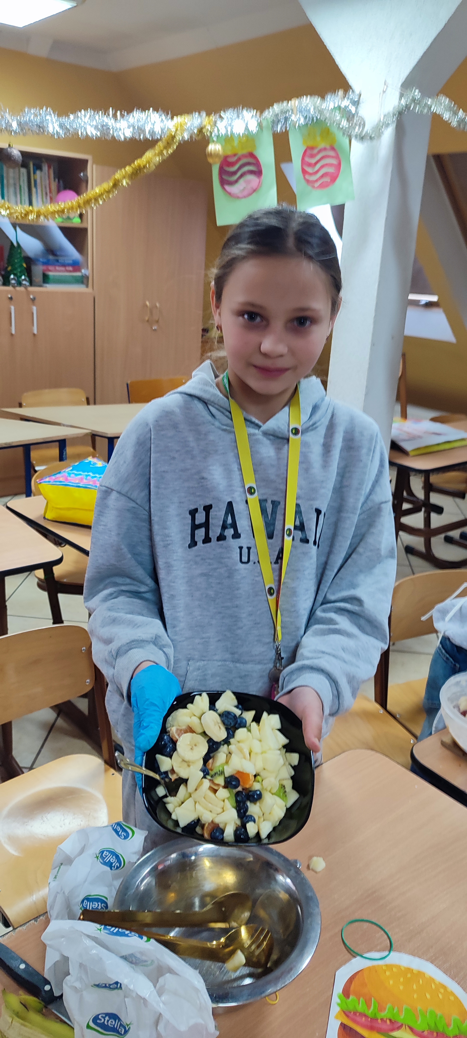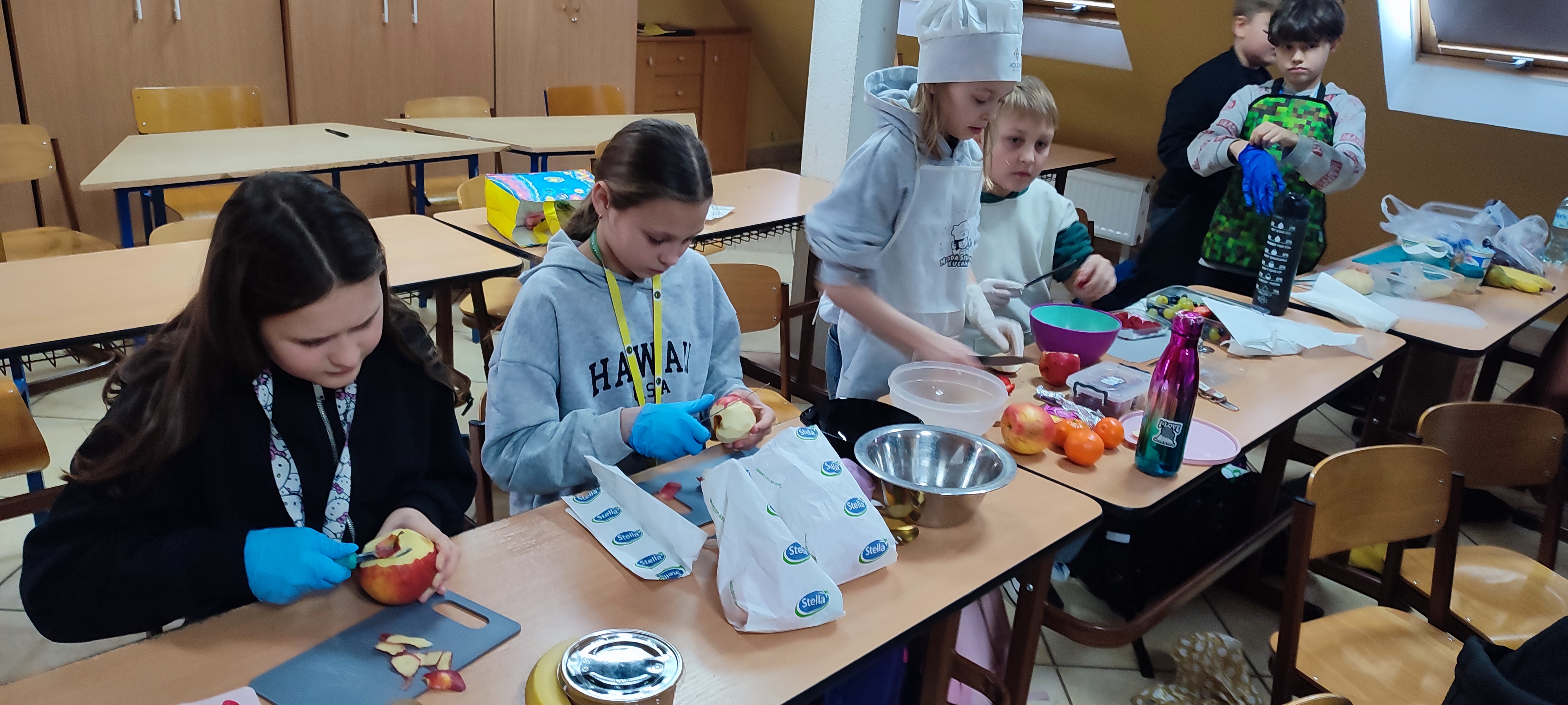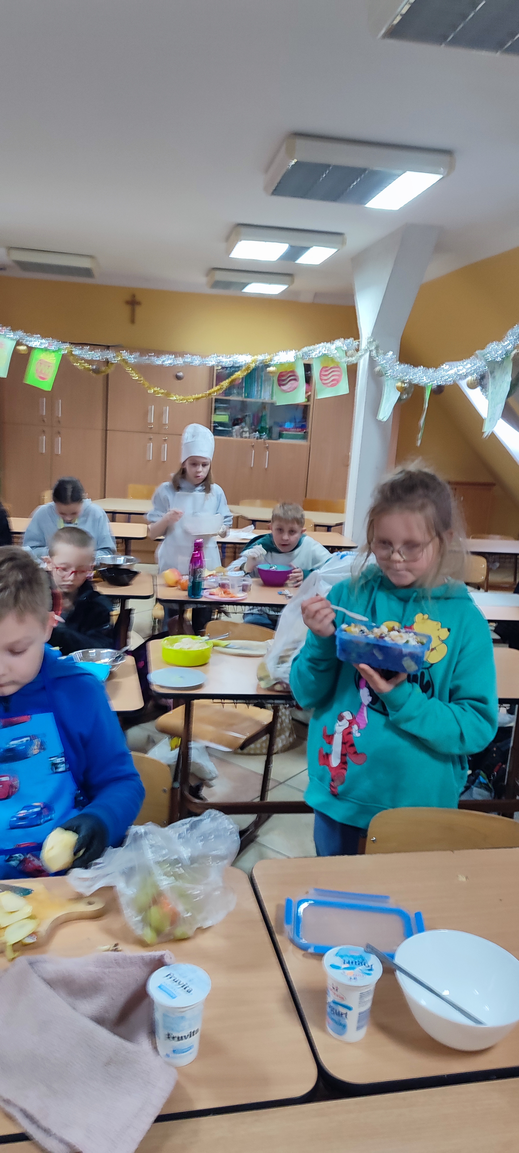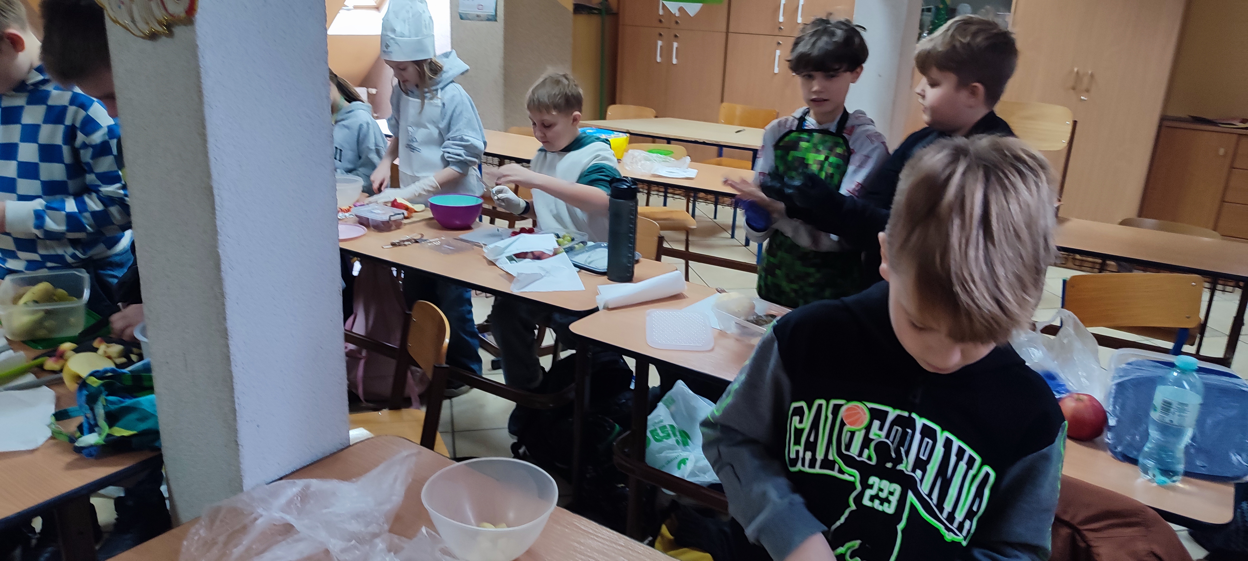 Podczas warsztatów kulinarnych na godzinie wychowawczej uczniowie przygotowali pyszną sałatkę owocową. Wykorzystano owoce rodzime – jabłka i gruszki – oraz owoce z krajów południowych: pomarańcze, mandarynki, awokado, granaty, banany, borówki, kiwi i winogrona. Całość została połączona z jogurtem naturalnym. Wszystkie przygotowane warianty były bardzo sm aczne, a zajęcia przebiegły w miłej i radosnej atmosferze.