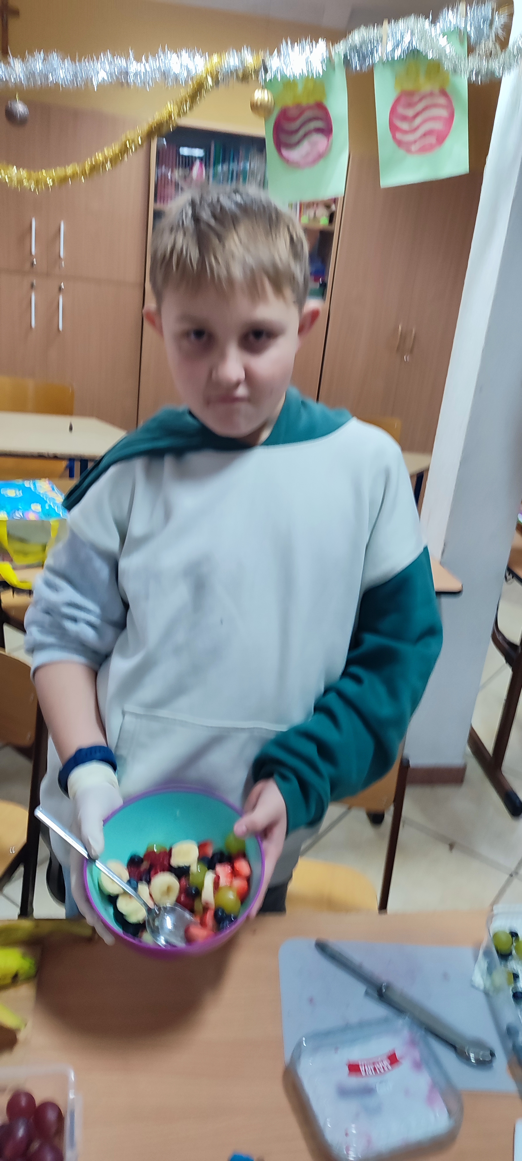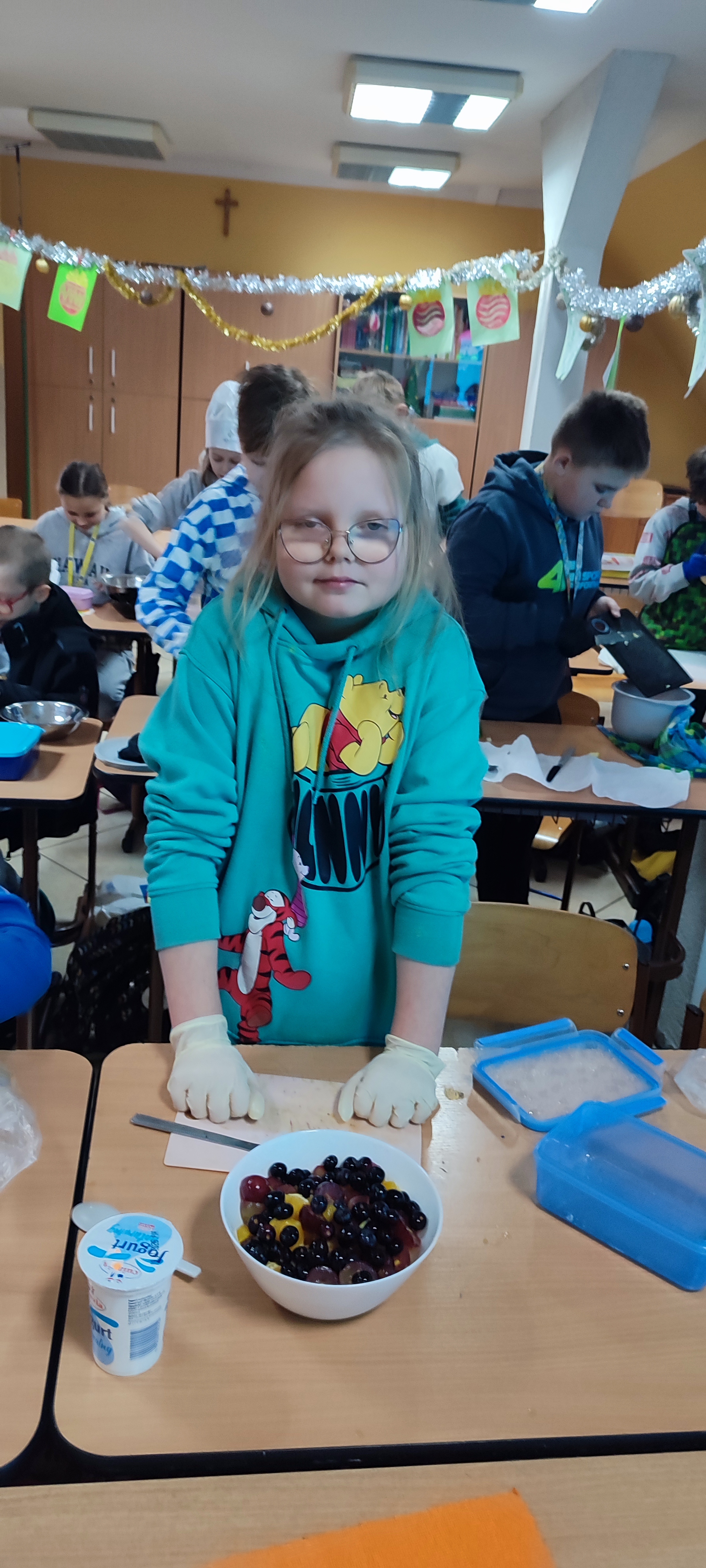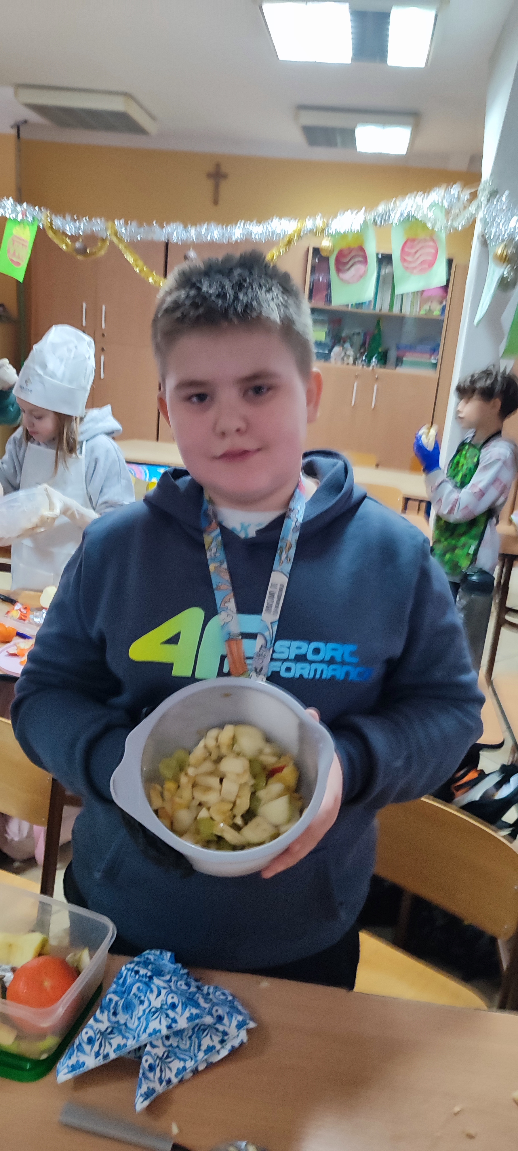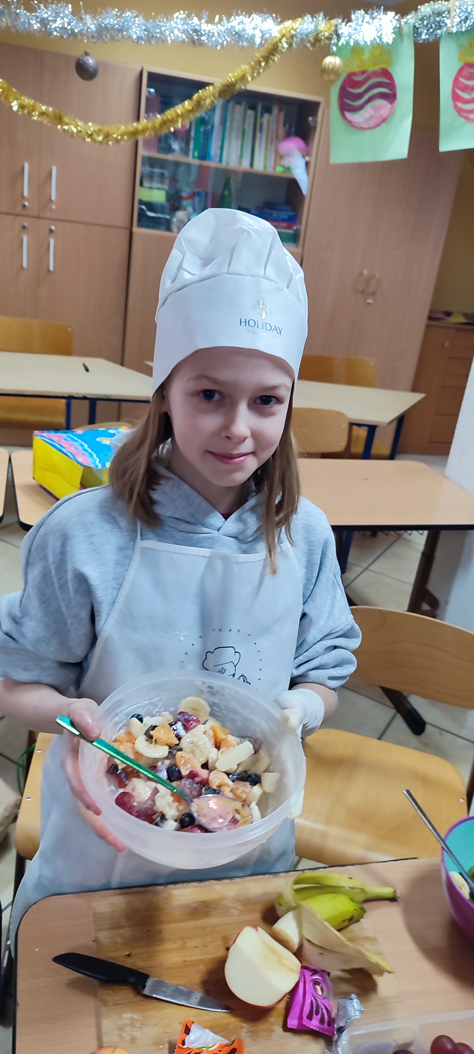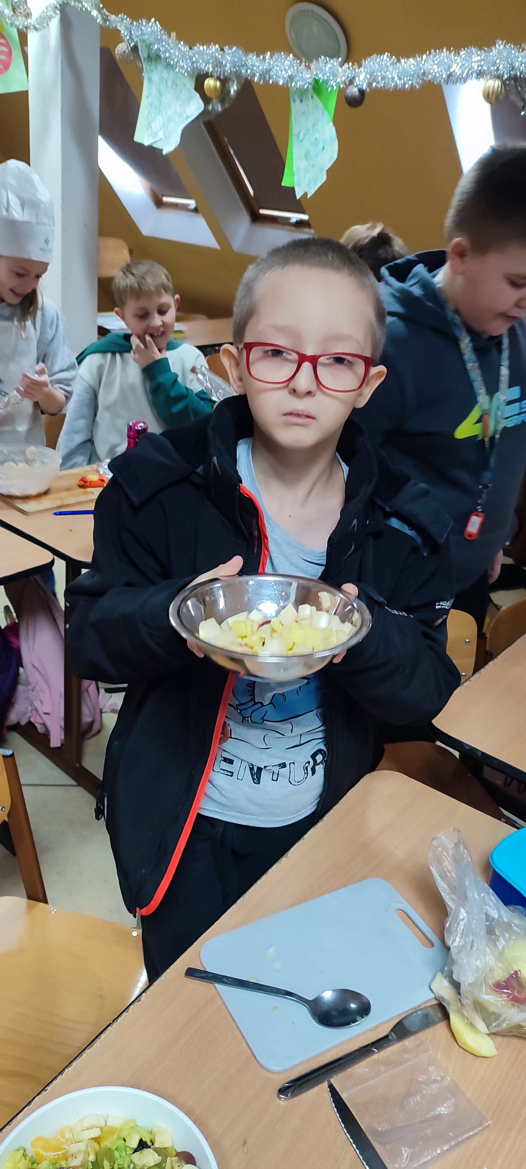 Podczas warsztatów kulinarnych na godzinie wychowawczej uczniowie przygotowali pyszną sałatkę owocową. Wykorzystano owoce rodzime – jabłka i gruszki – oraz owoce z krajów południowych: pomarańcze, mandarynki, awokado, granaty, banany, borówki, kiwi i winogrona. Całość została połączona z jogurtem naturalnym. Wszystkie przygotowane warianty były bardzo sm aczne, a zajęcia przebiegły w miłej i radosnej atmosferze.