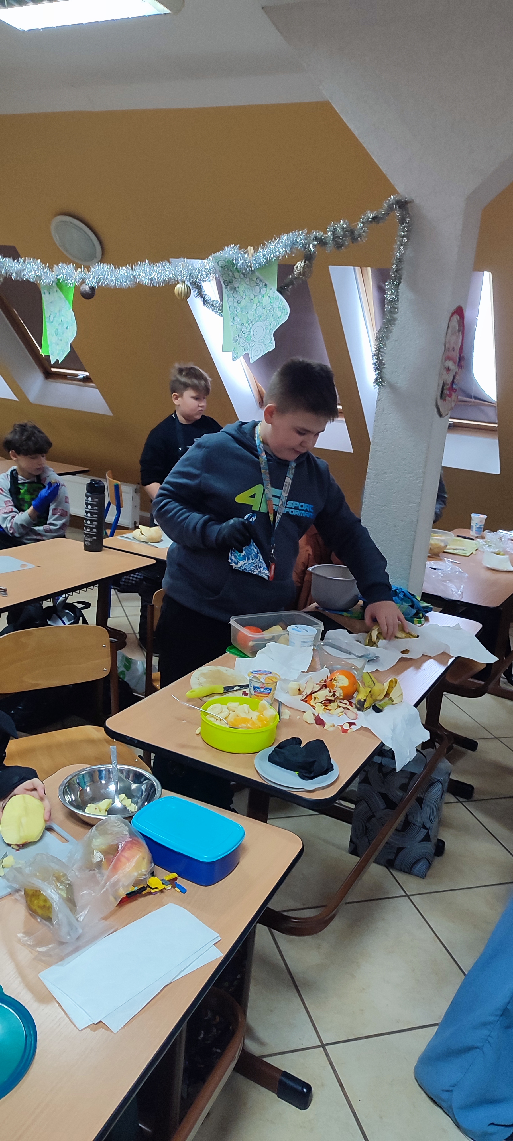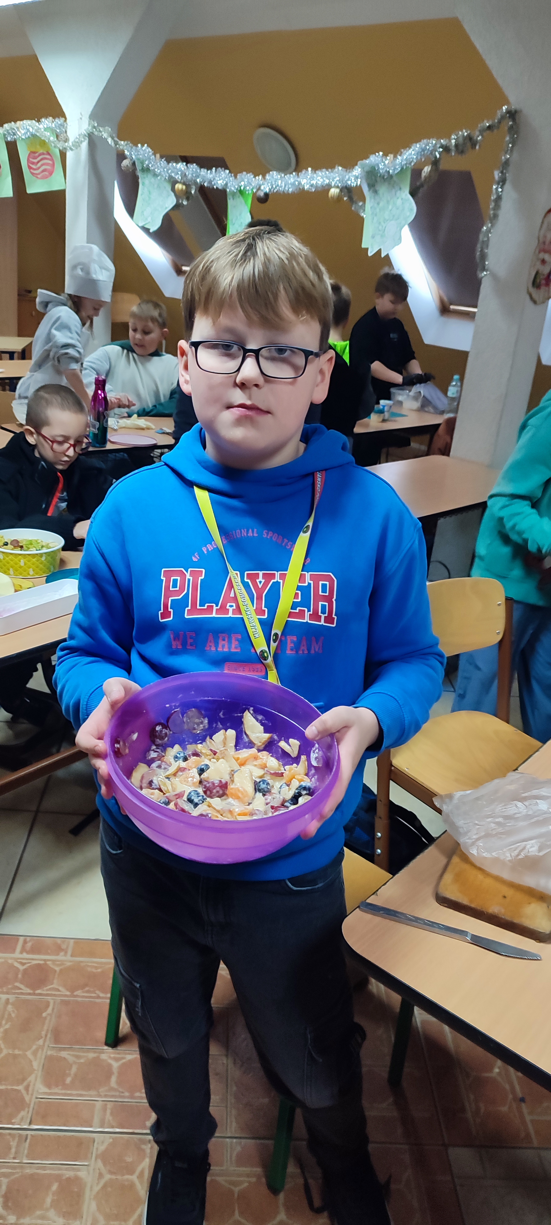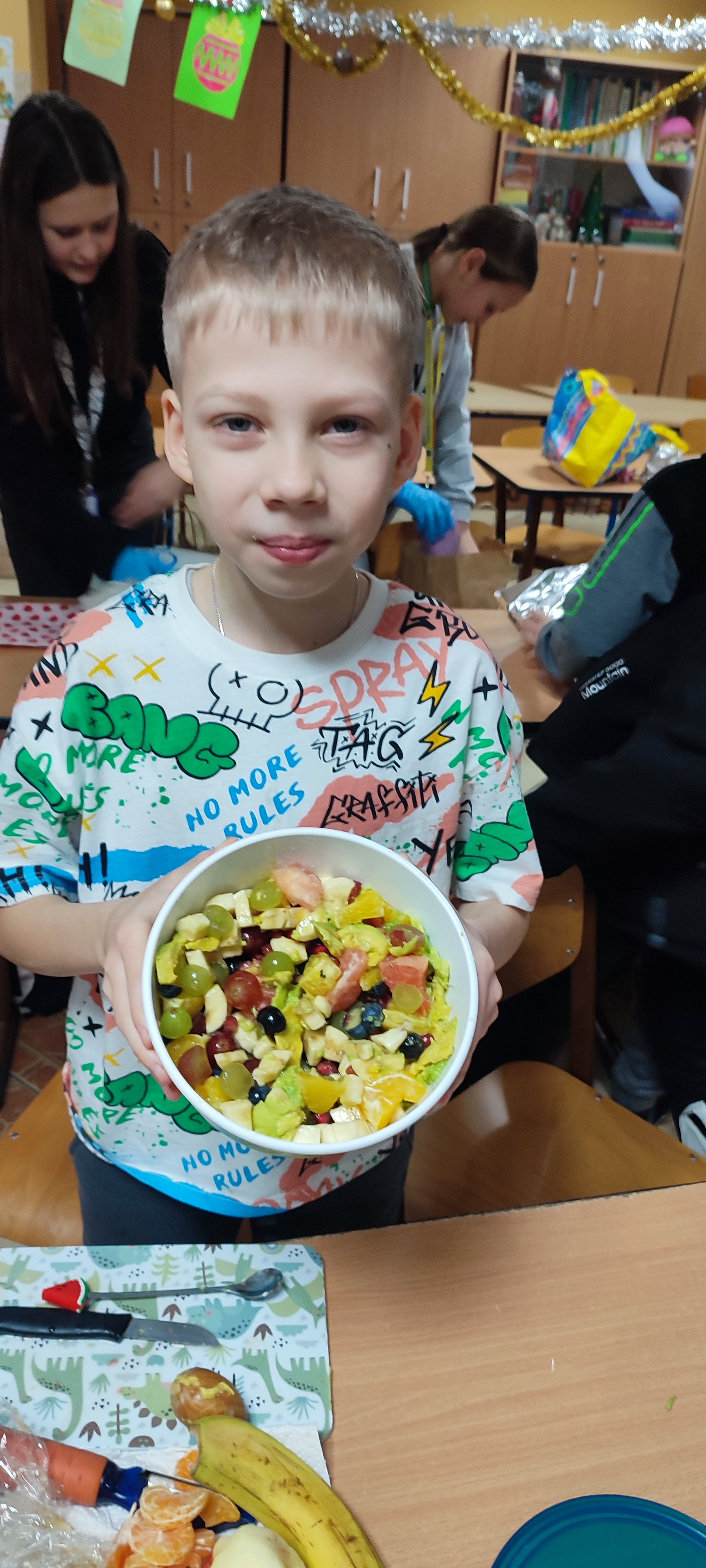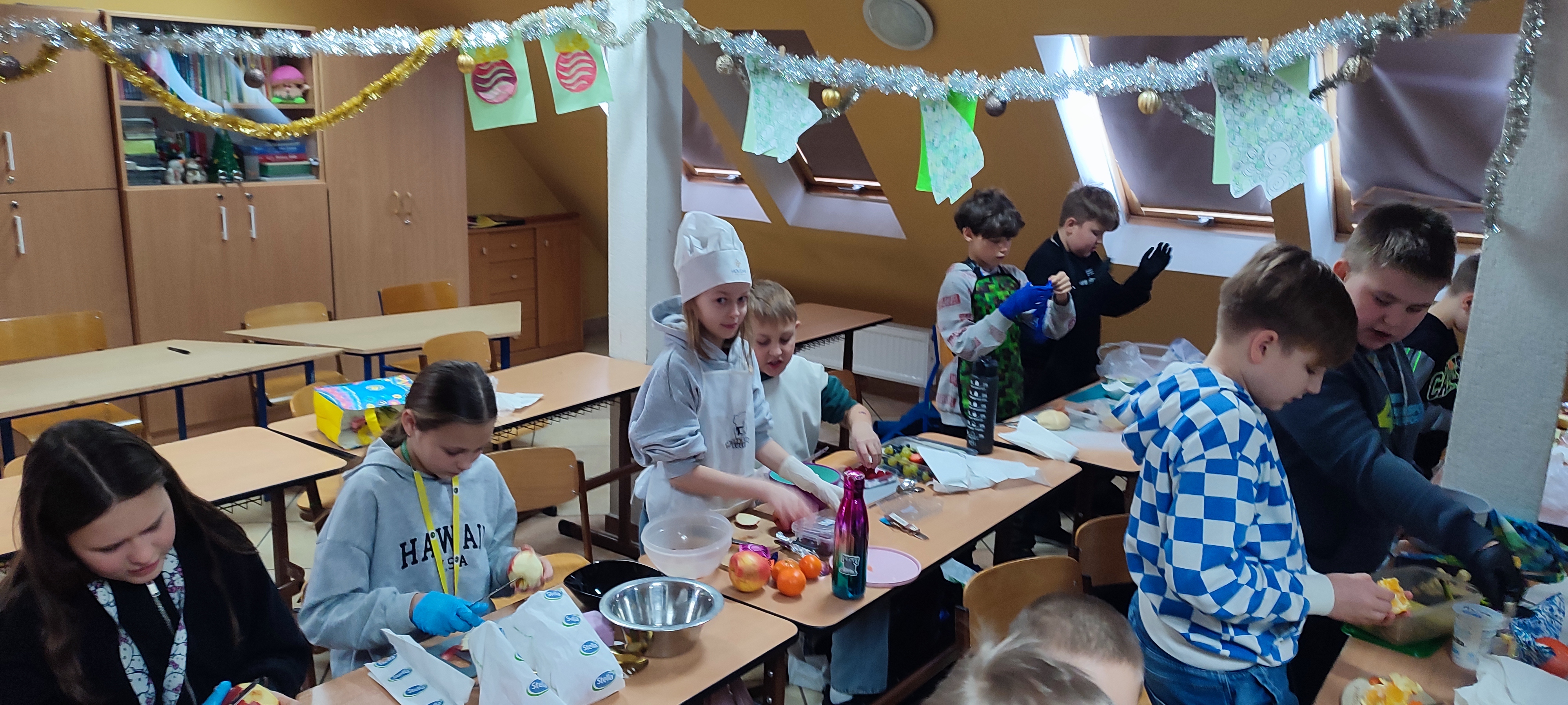 Podczas warsztatów kulinarnych na godzinie wychowawczej uczniowie przygotowali pyszną sałatkę owocową. Wykorzystano owoce rodzime – jabłka i gruszki – oraz owoce z krajów południowych: pomarańcze, mandarynki, awokado, granaty, banany, borówki, kiwi i winogrona. Całość została połączona z jogurtem naturalnym. Wszystkie przygotowane warianty były bardzo sm aczne, a zajęcia przebiegły w miłej i radosnej atmosferze.