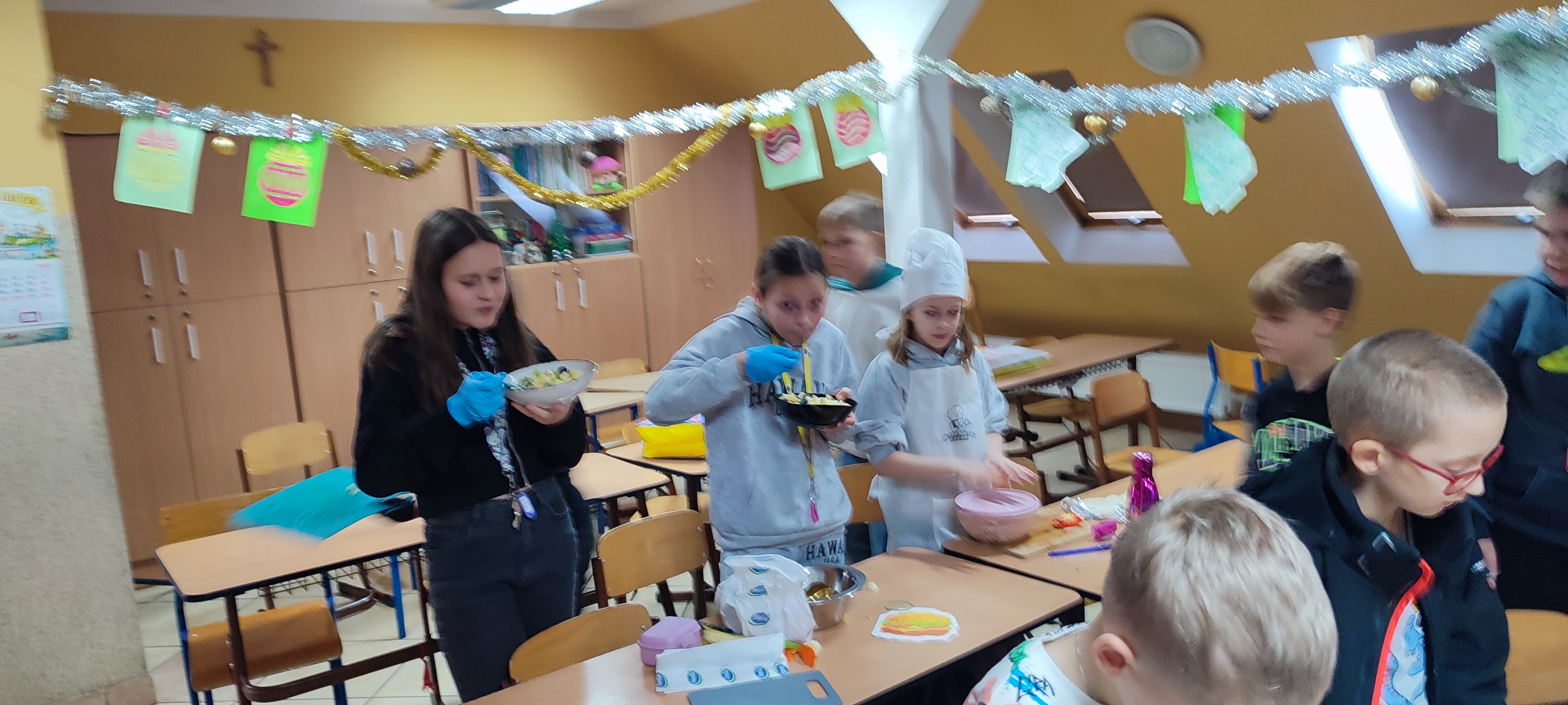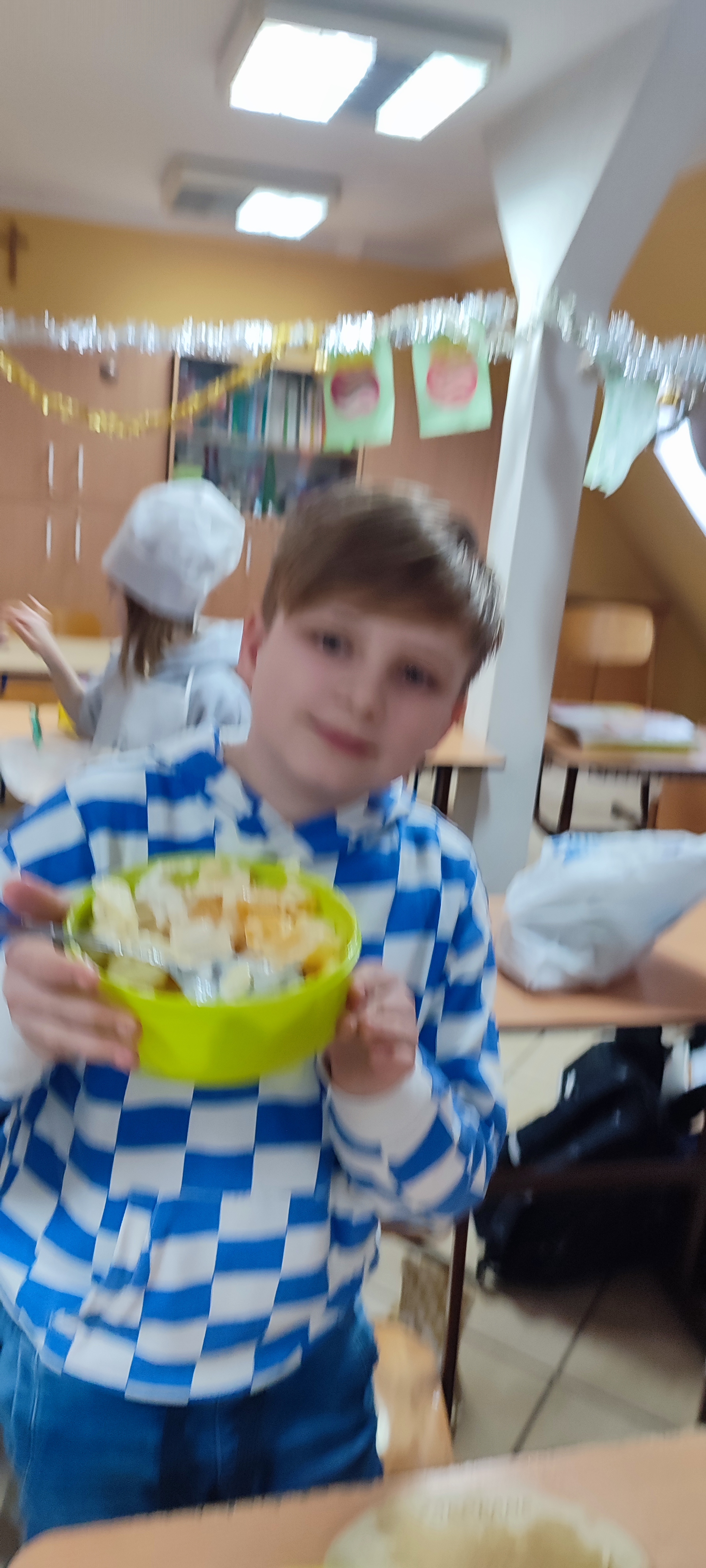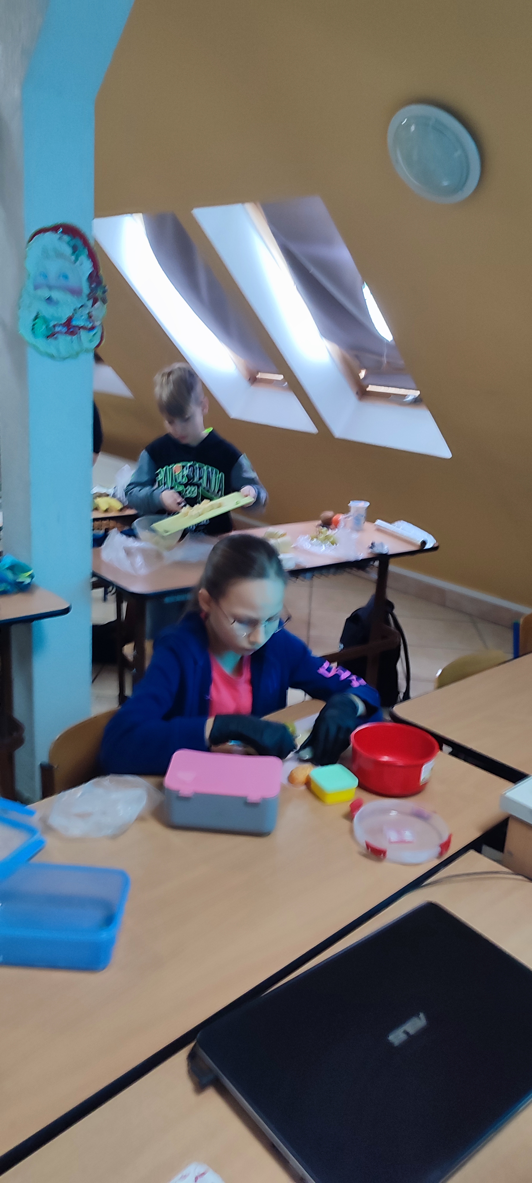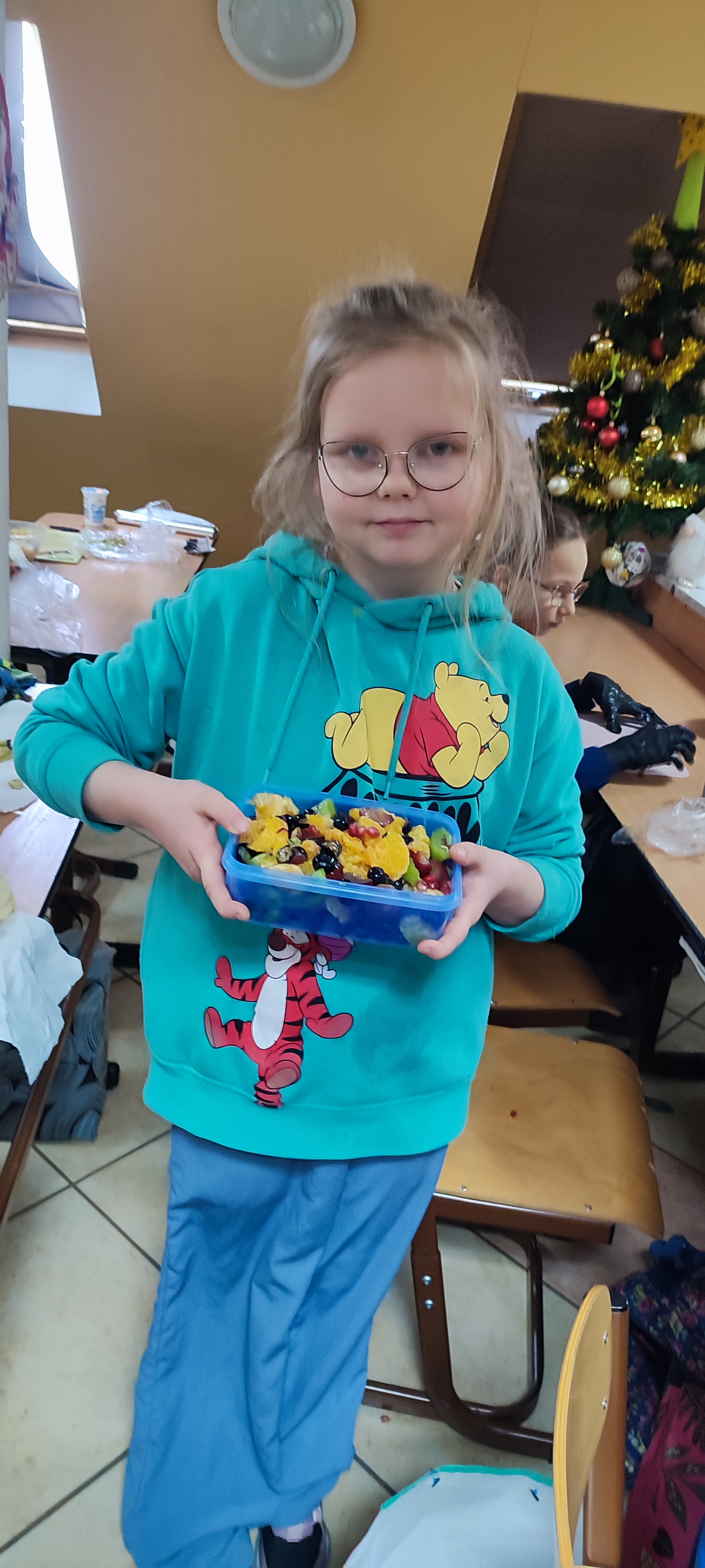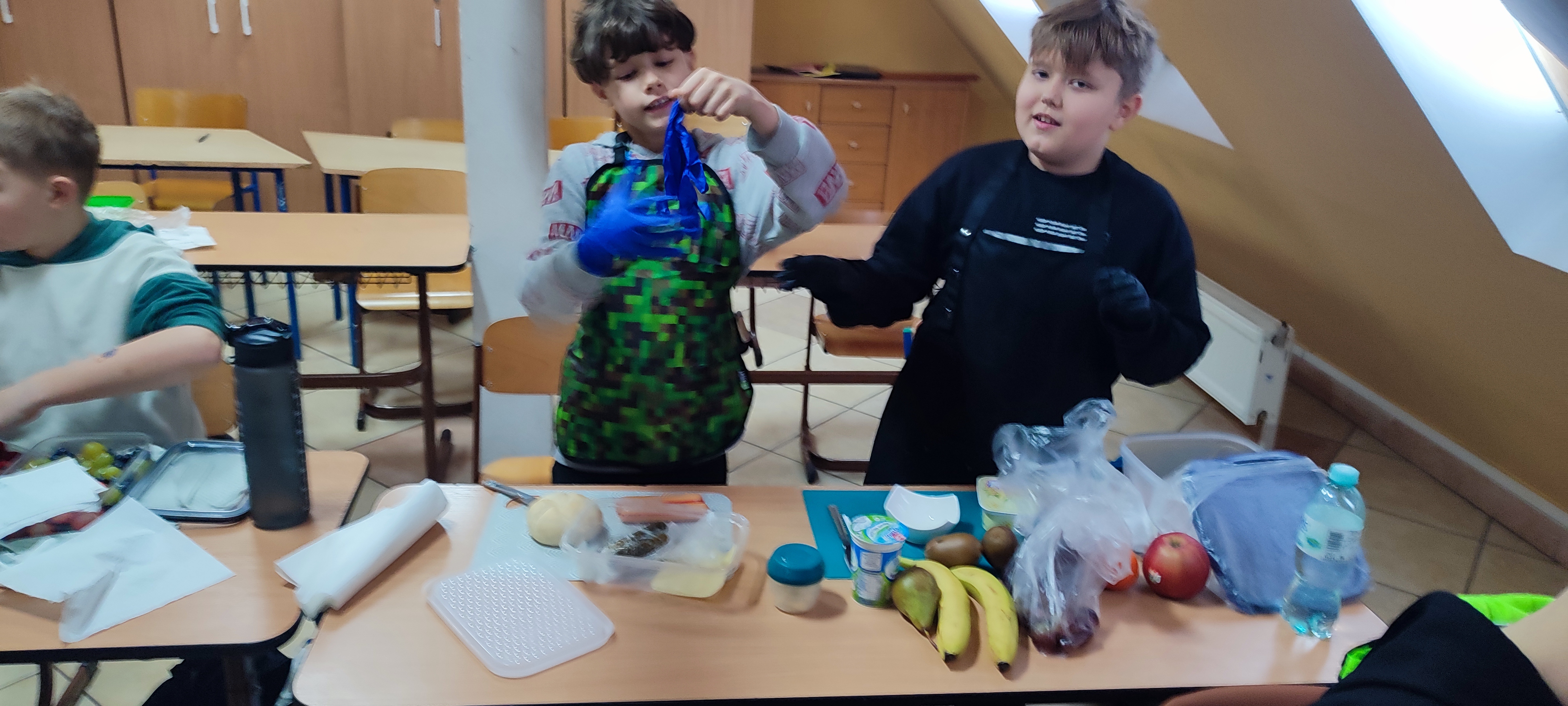 Podczas warsztatów kulinarnych na godzinie wychowawczej uczniowie przygotowali pyszną sałatkę owocową. Wykorzystano owoce rodzime – jabłka i gruszki – oraz owoce z krajów południowych: pomarańcze, mandarynki, awokado, granaty, banany, borówki, kiwi i winogrona. Całość została połączona z jogurtem naturalnym. Wszystkie przygotowane warianty były bardzo sm aczne, a zajęcia przebiegły w miłej i radosnej atmosferze.