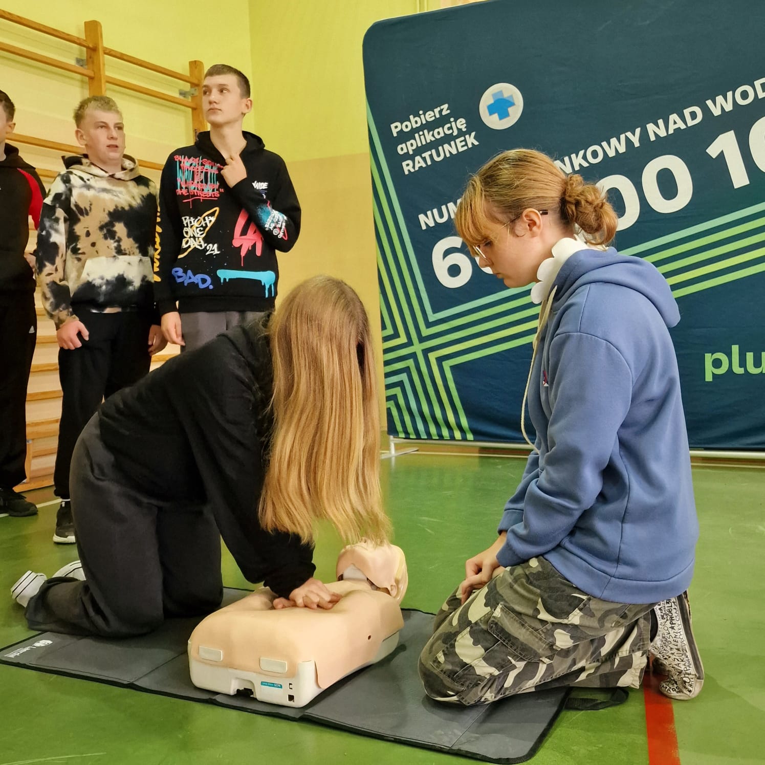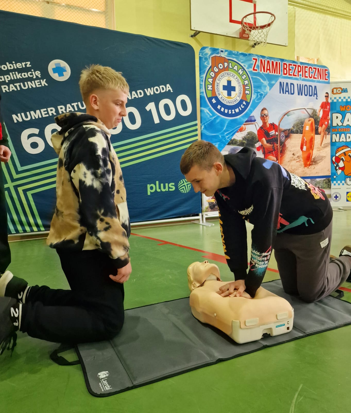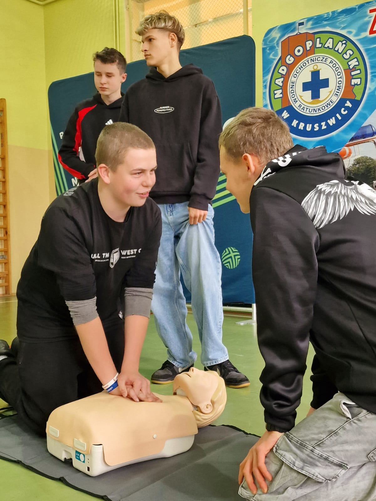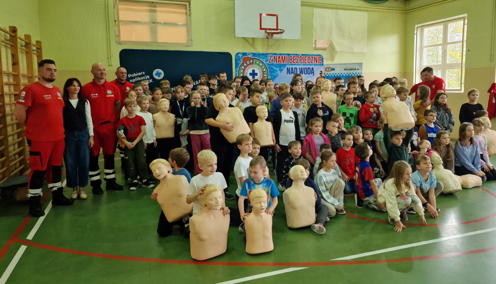 16. października włączyliśmy się w ogólnopolską akcję bicia rekordu w jednoczesnym uciskaniu klatki piersiowej. To niezwykła akcja, gdyż nie chodzi w niej tylko obicie rekordu i rywalizację, ale przede wszystkim o naukę udzielania pierwszej pomocy. Wraz z uczniami młodszych klas i nauczycielami, pod czujnym okiem ratowników z Nadgoplańskiego WOPR, przez 30 minut ćwiczyliśmy umiejętność uciskania klatki piersiowej, szczególnie ważną, gdy chodzi o ratowanie życia drugiego człowieka.