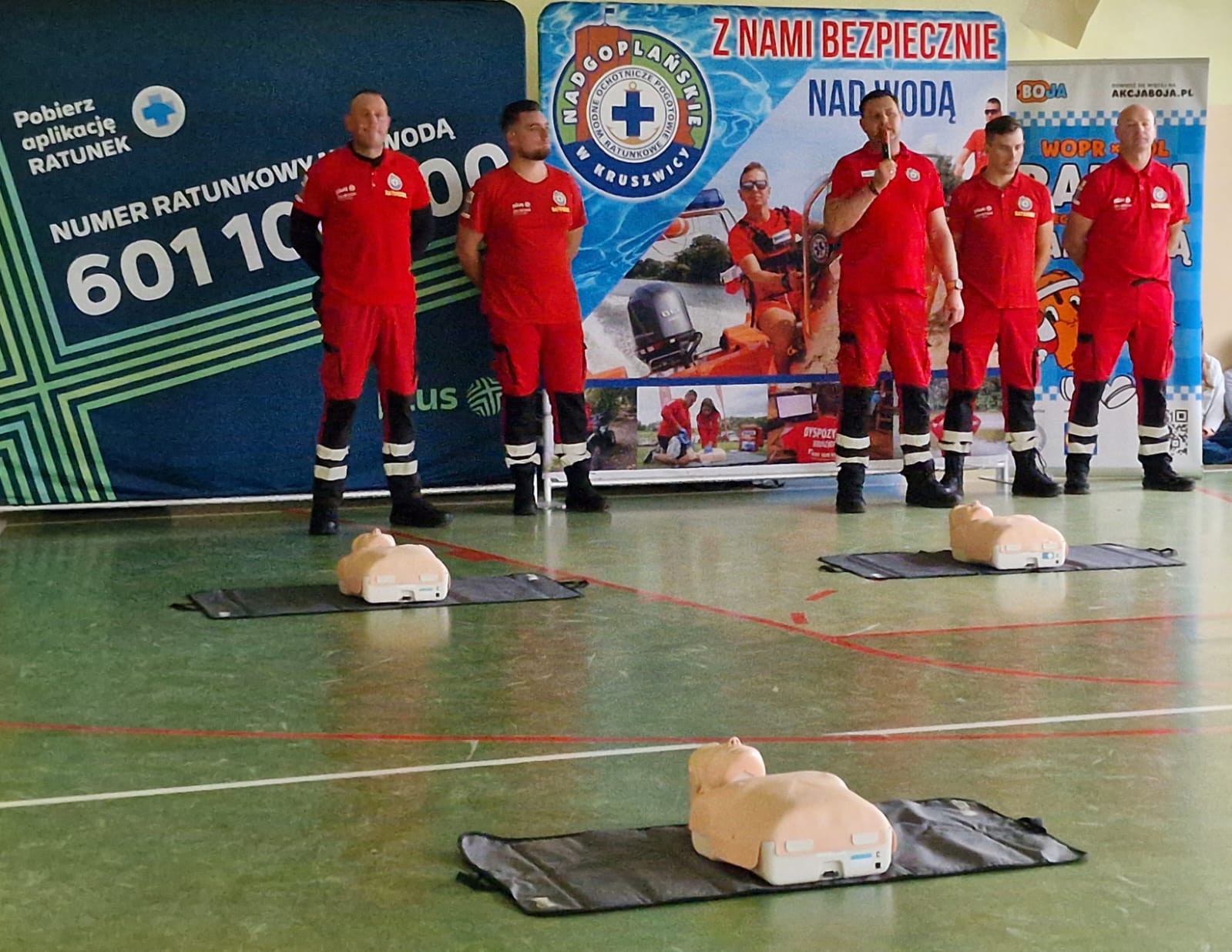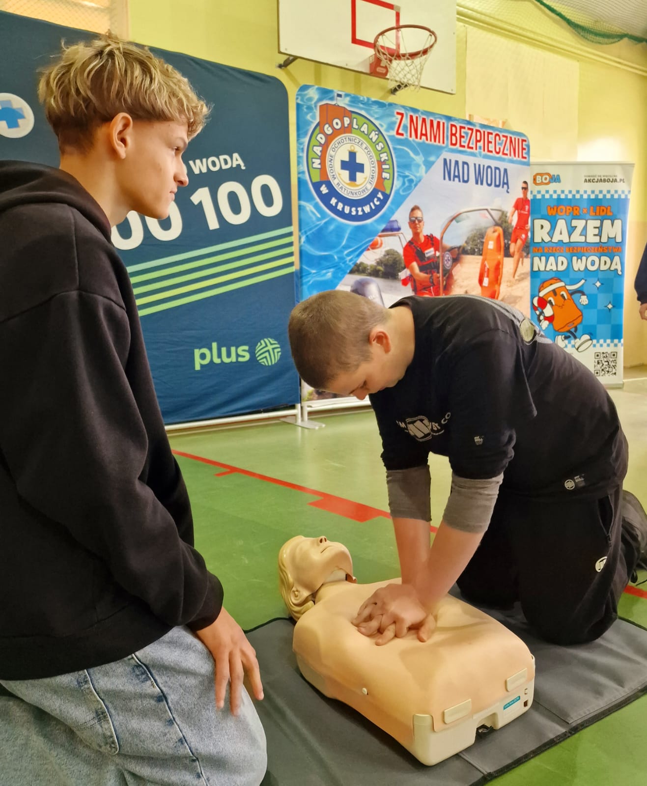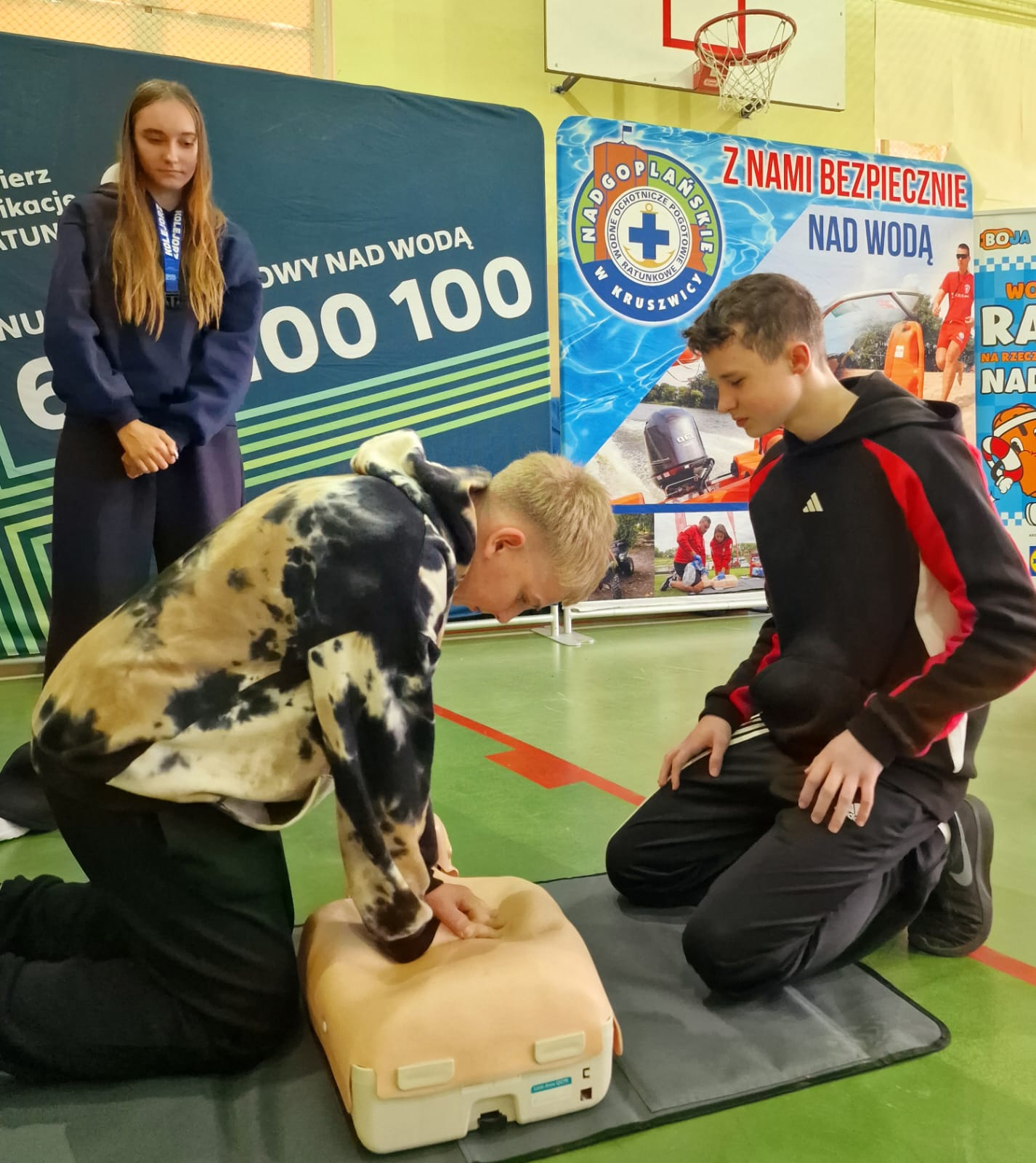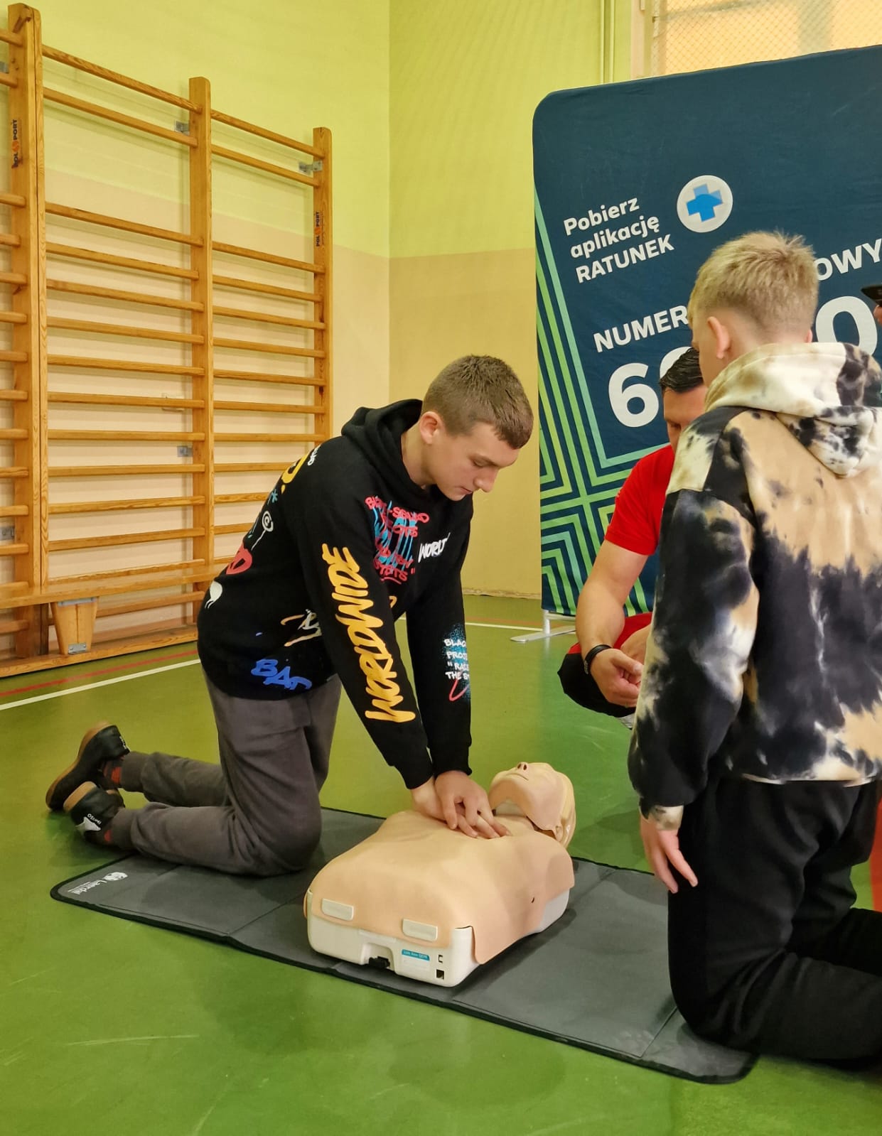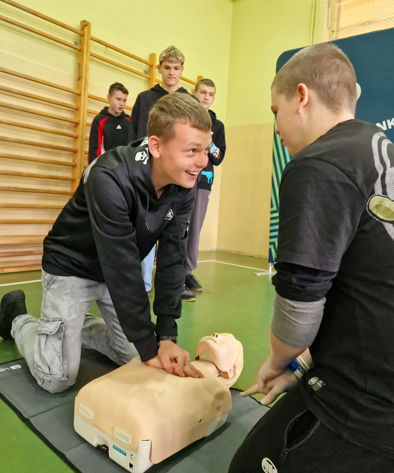 16. października włączyliśmy się w ogólnopolską akcję bicia rekordu w jednoczesnym uciskaniu klatki piersiowej. To niezwykła akcja, gdyż nie chodzi w niej tylko obicie rekordu i rywalizację, ale przede wszystkim o naukę udzielania pierwszej pomocy. Wraz z uczniami młodszych klas i nauczycielami, pod czujnym okiem ratowników z Nadgoplańskiego WOPR, przez 30 minut ćwiczyliśmy umiejętność uciskania klatki piersiowej, szczególnie ważną, gdy chodzi o ratowanie życia drugiego człowieka.
