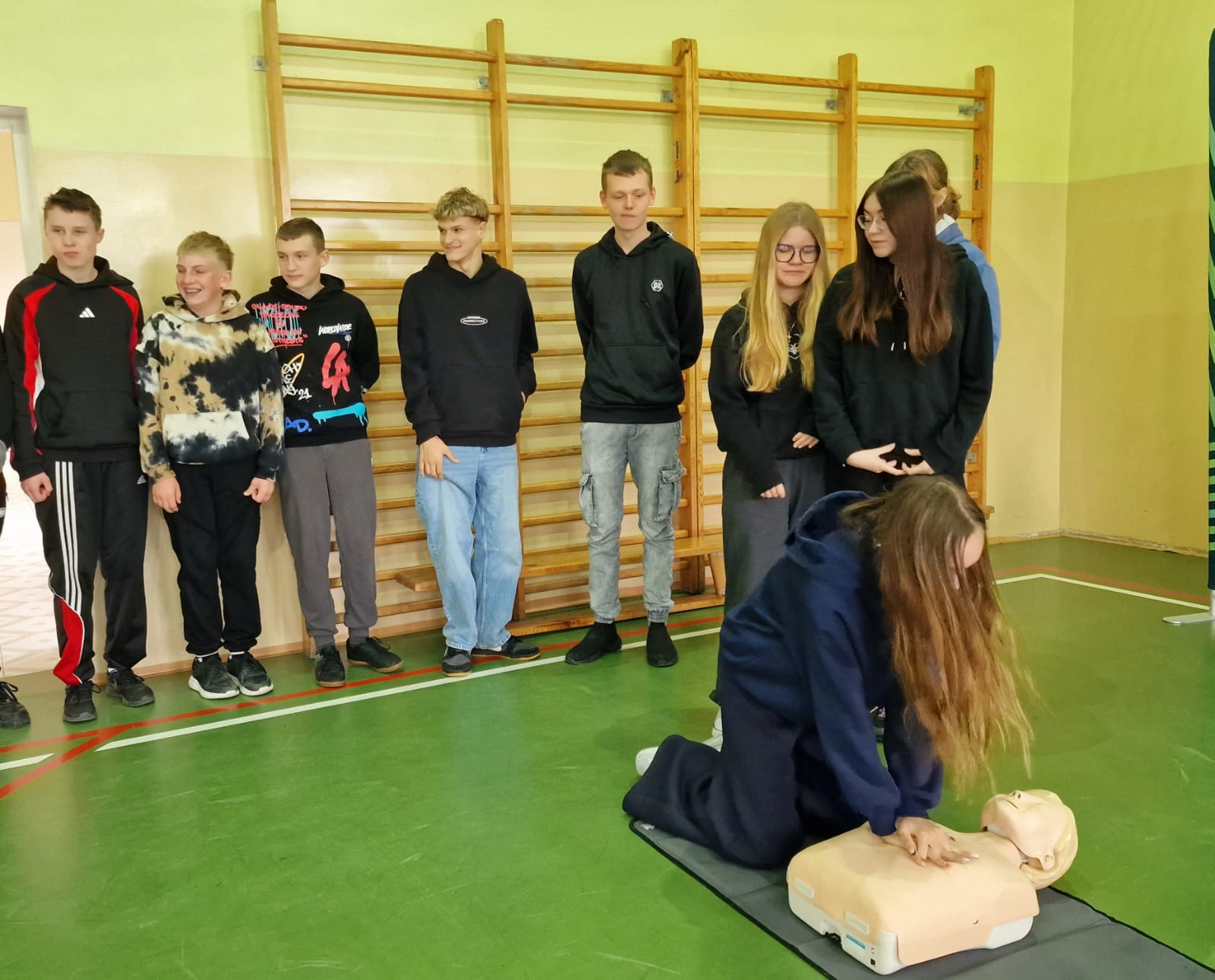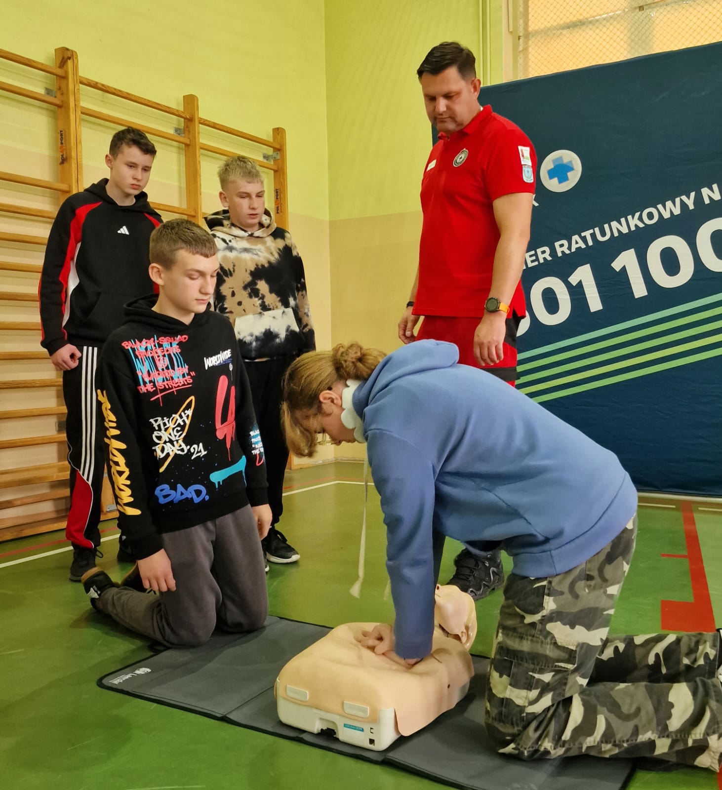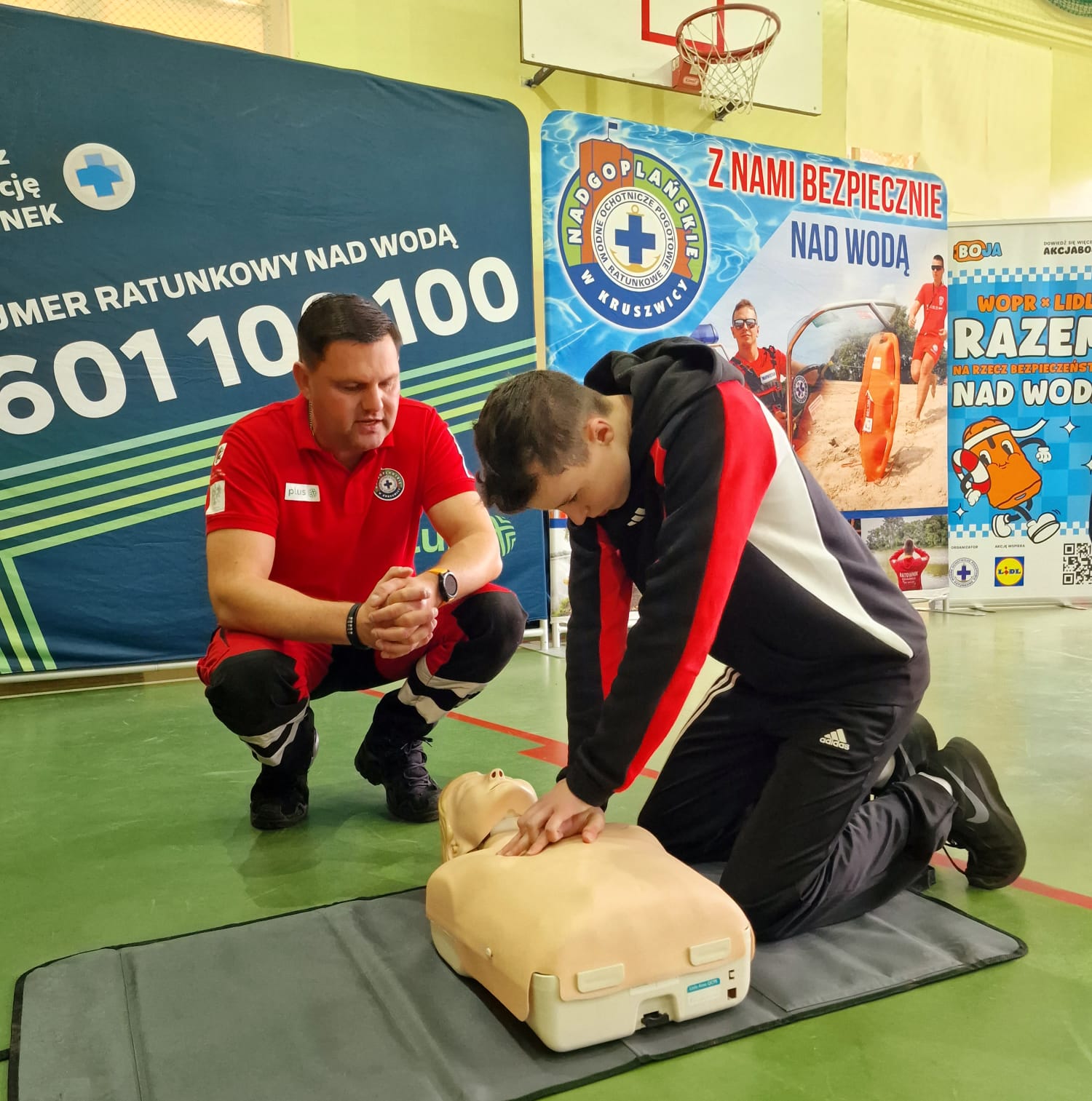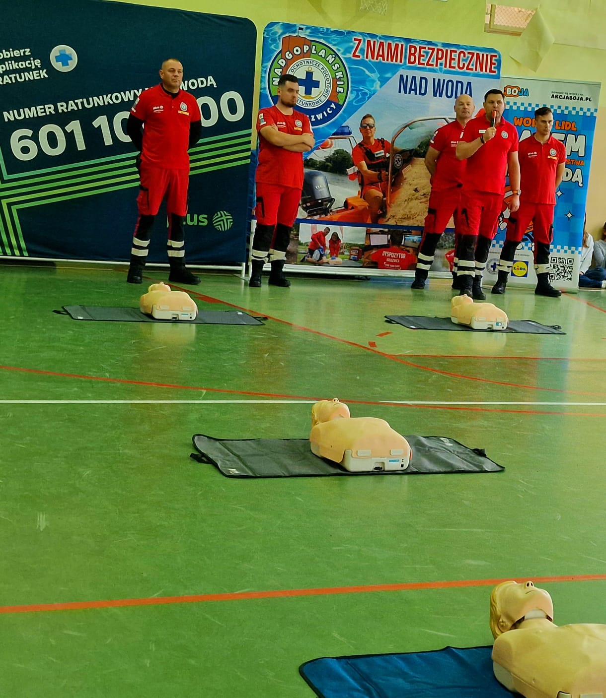 16. października włączyliśmy się w ogólnopolską akcję bicia rekordu w jednoczesnym uciskaniu klatki piersiowej. To niezwykła akcja, gdyż nie chodzi w niej tylko obicie rekordu i rywalizację, ale przede wszystkim o naukę udzielania pierwszej pomocy. Wraz z uczniami młodszych klas i nauczycielami, pod czujnym okiem ratowników z Nadgoplańskiego WOPR, przez 30 minut ćwiczyliśmy umiejętność uciskania klatki piersiowej, szczególnie ważną, gdy chodzi o ratowanie życia drugiego człowieka.